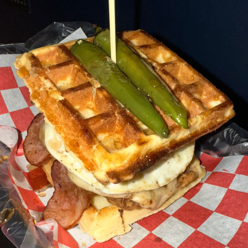 Pechuga de pollo crujiente, con huevo estrellado, tocino, queso, emparedado en dos waffles doraditos