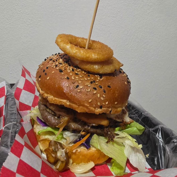 Lechuga, jitomate, cebolla, rajas, bbq, catsup, mayonesa, mostaza, sirloin con tocino, champinones, aros de cebolla, mezcla de quesos, y jalapenos toreados