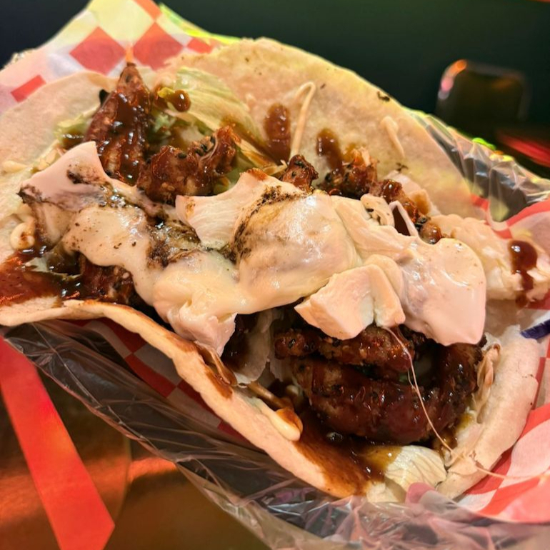 Burger de costillita de puerco recién despegada del hueso, sancochada y bañada en salsa BBQ o hot buffalo.