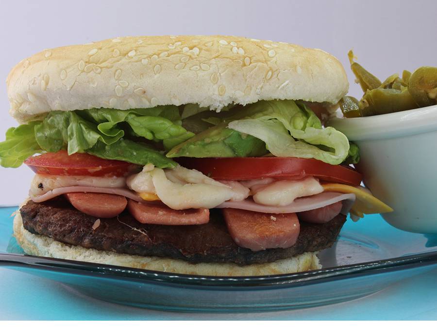 Exquisita combinación de milanesa, chorizo, pollo, pierna, salchicha, huevo, queso oaxaca, queso amarillo, queso de puerco y jamón.