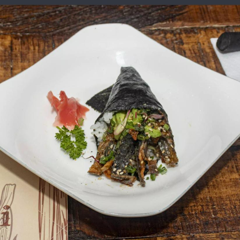 Cono de alga con arroz relleno de aguacate, pepino, piel frita y salsa de anguila.