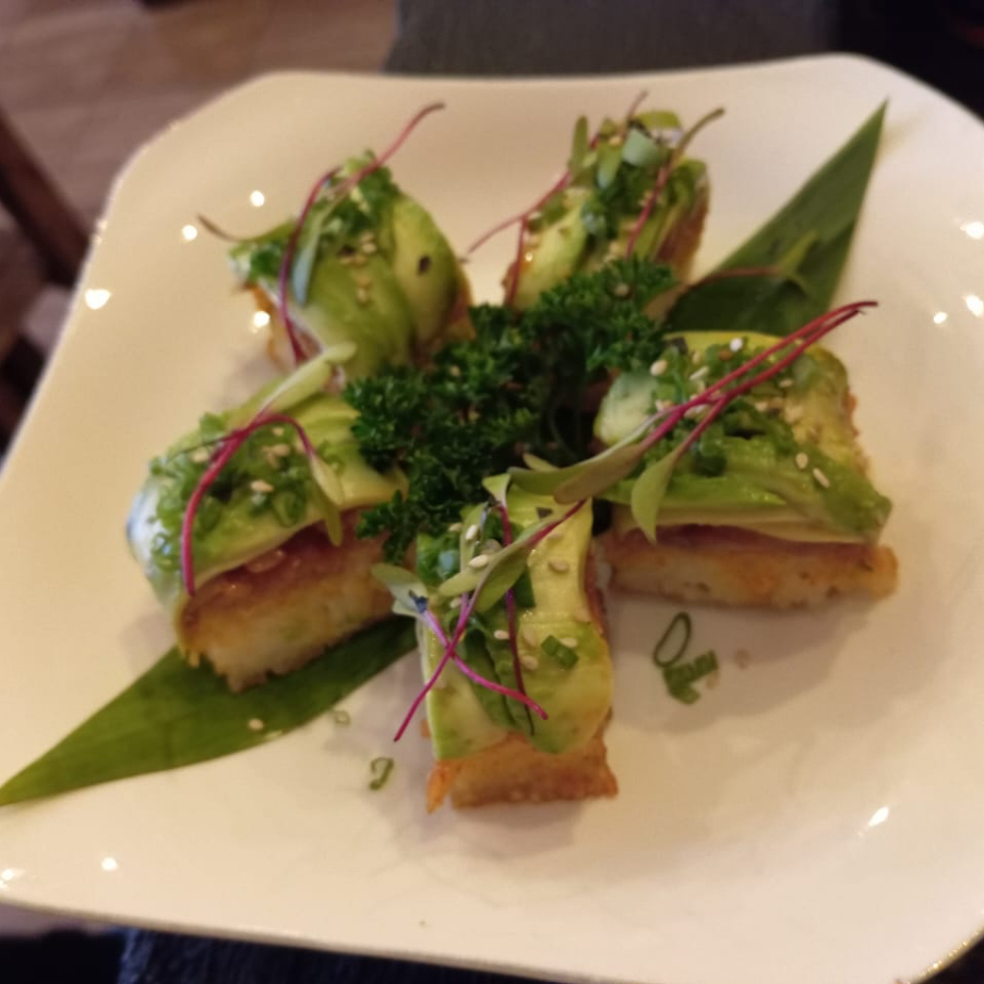 Aguacate, pepino, papel de soya y topping de Tampico y pulpo frito.