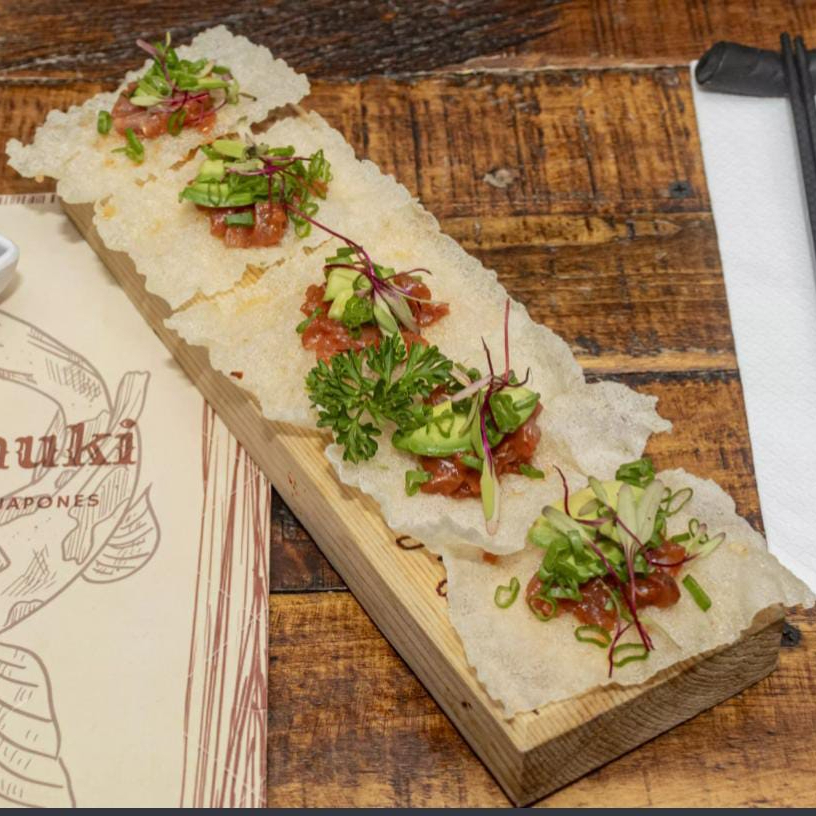 Pastelito de atún spicy y aguacate con 3 tostadas.