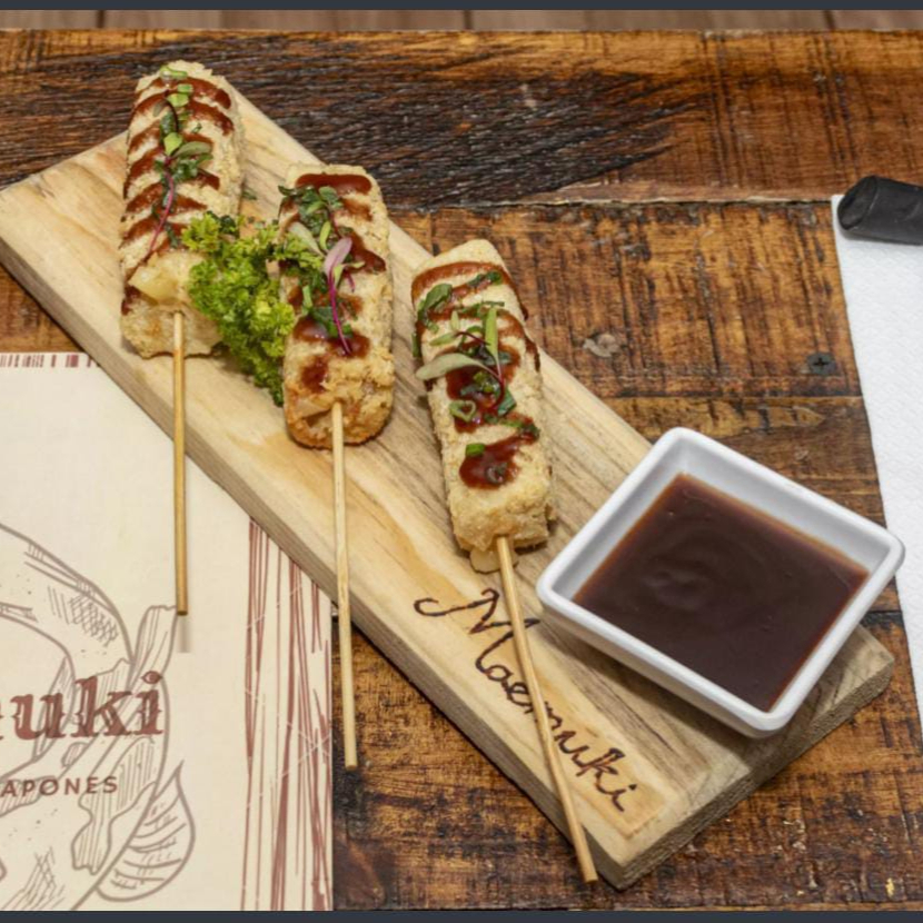 Empanaditas rellenas de carne bañadas en salsa teriyaki.
