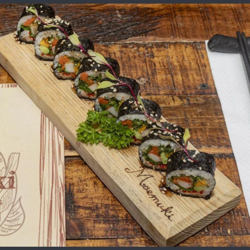 Papel de soya, pepino, aguacate y topping de pulpo con chile serrano, pimiento, cebollín y mayonesa.