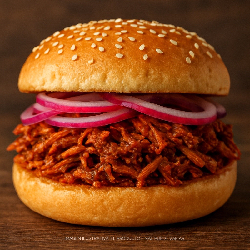 Hamburguesa de Cochinita Pibil (150grs mínimo) adicionada con aderezos, limón y cebolla morada.
