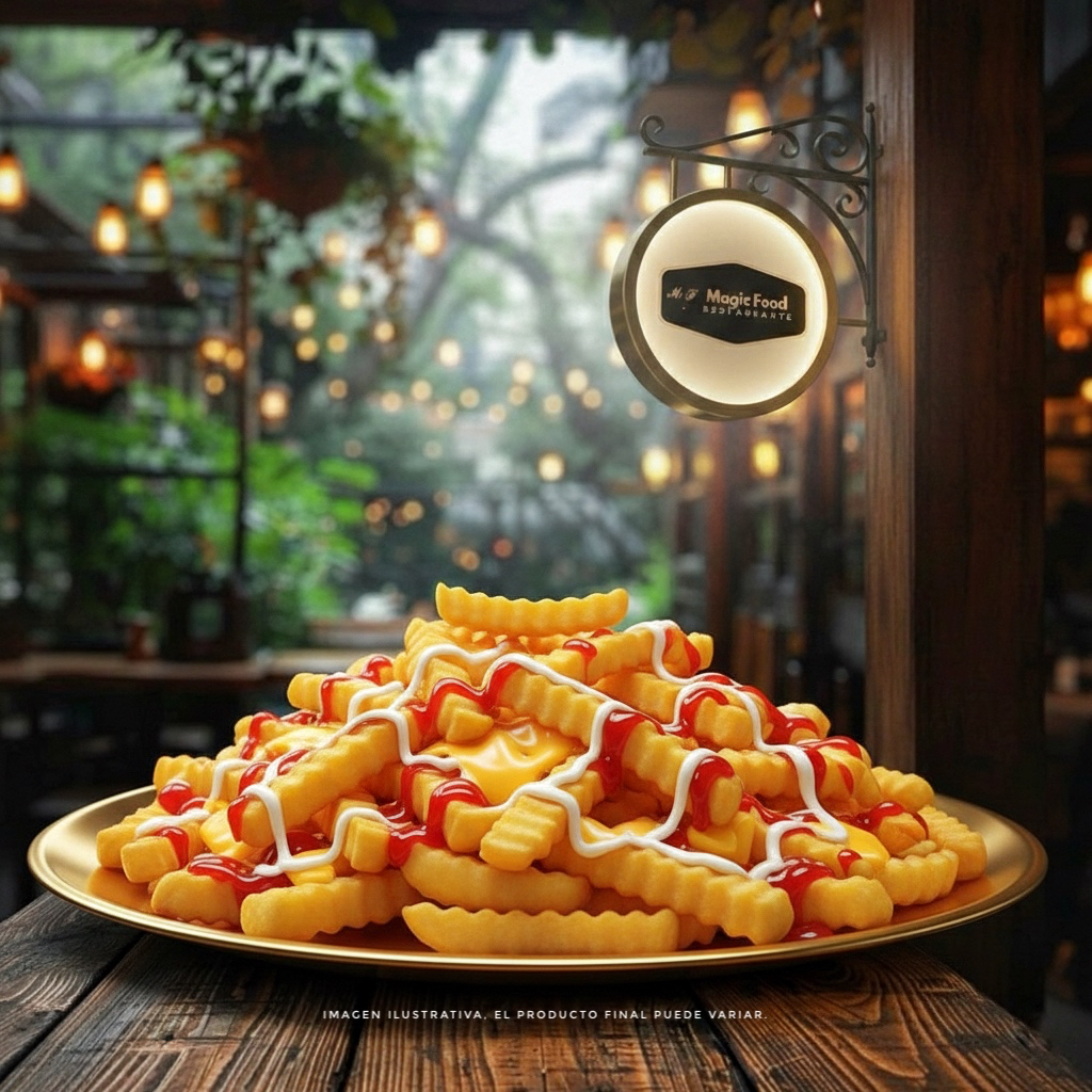 Papas a la francesa grandes con aditamentos premium y/o de calidad.