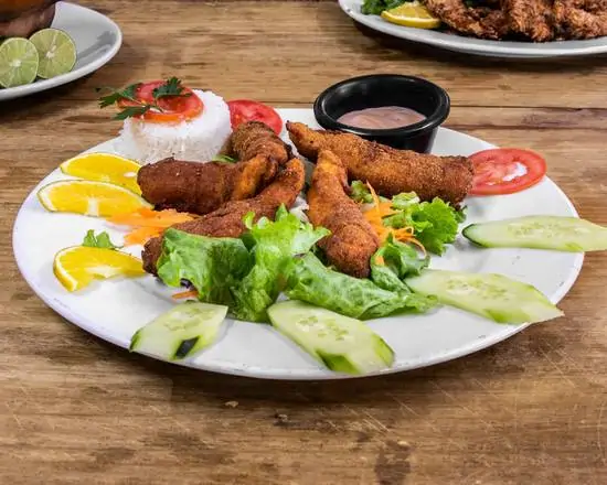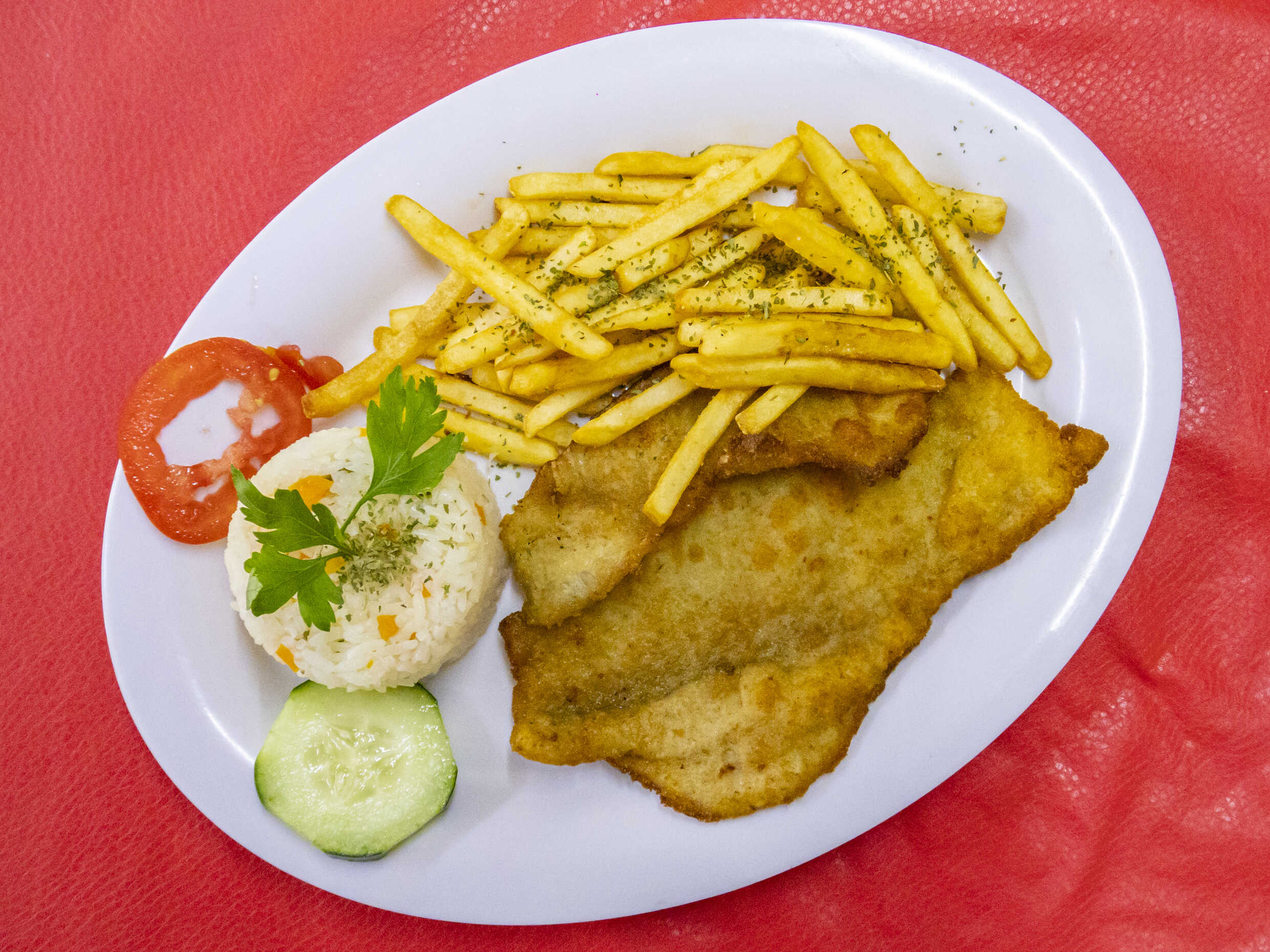 Filete empanizado, relleno de queso philadelphia, servido con ensalada de lechuga, pepino y naranja, una porción de arroz.