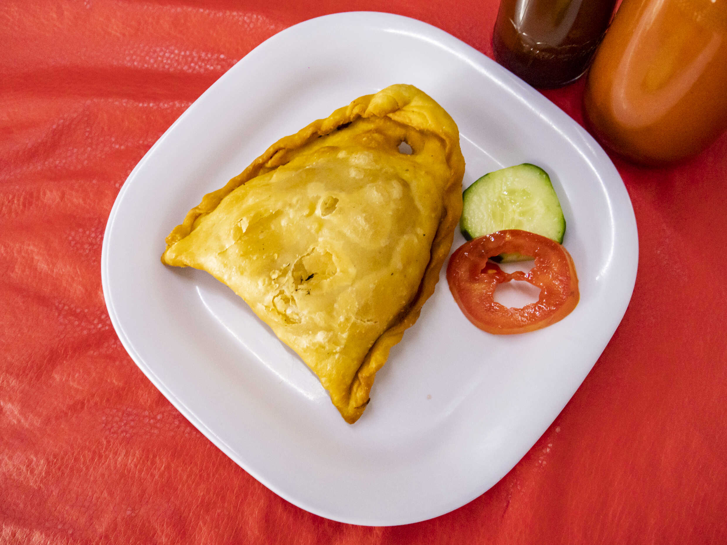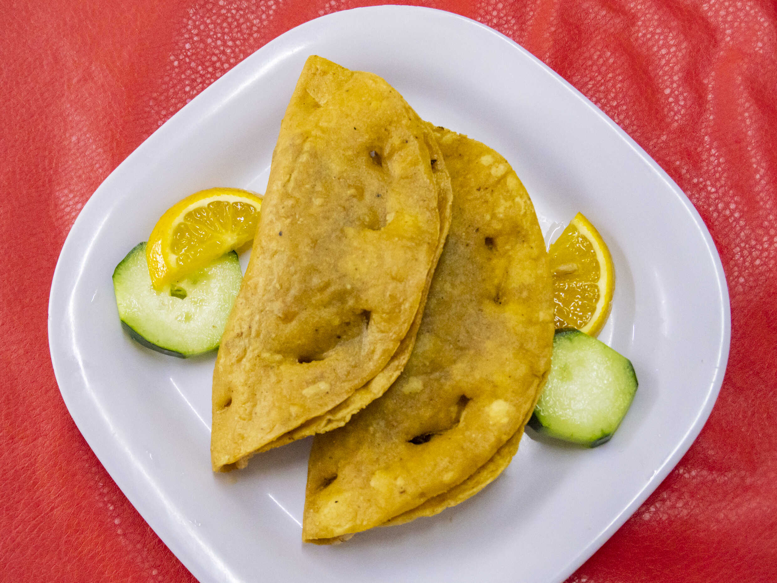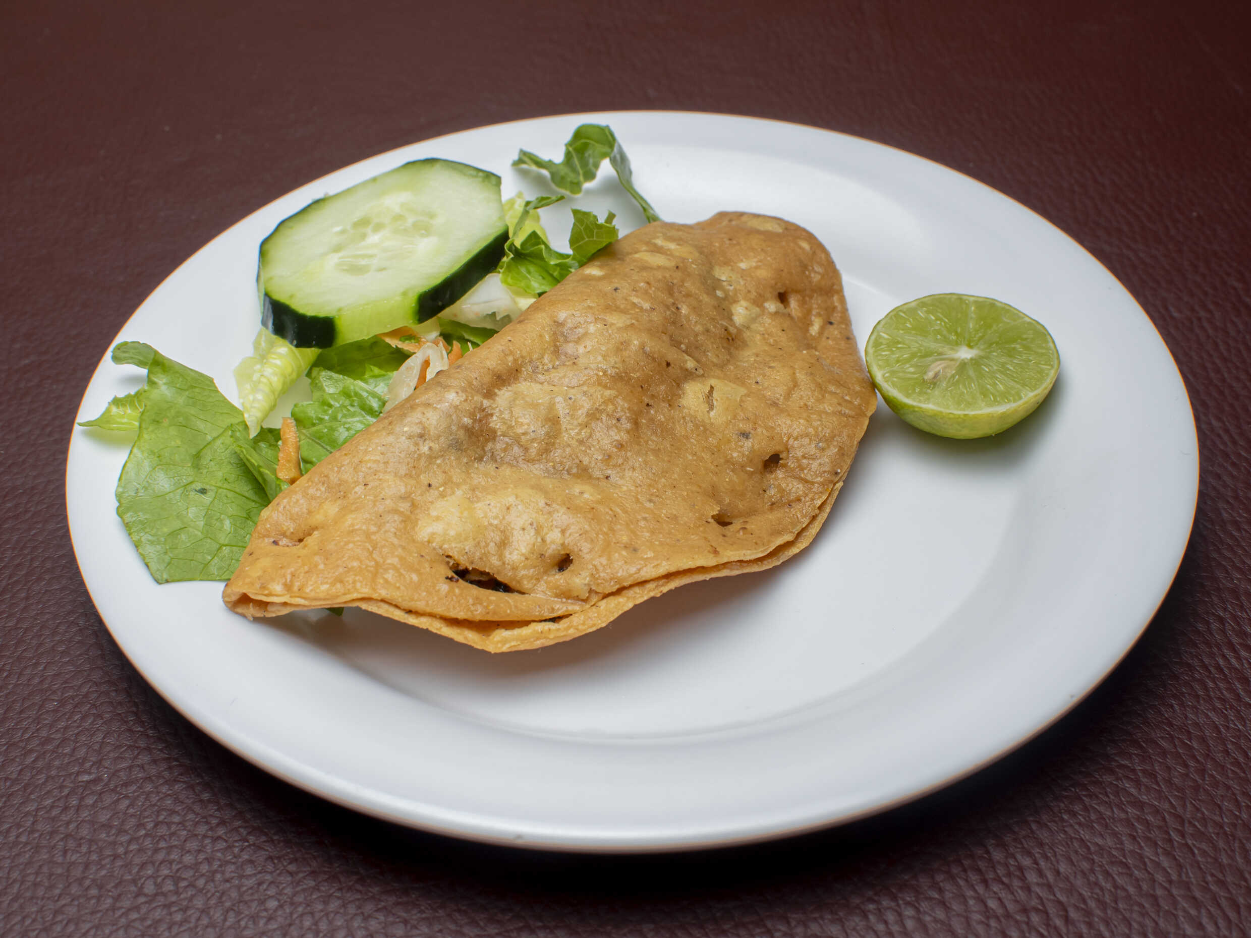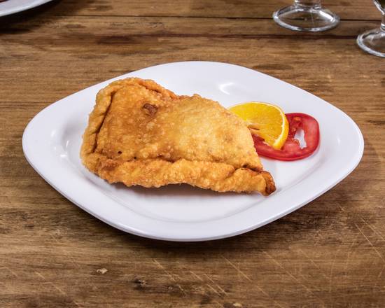 La empanada de pescado viene preparada con cebolla, jitomate y chile verde.