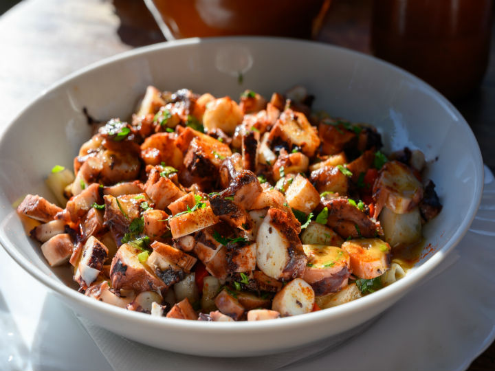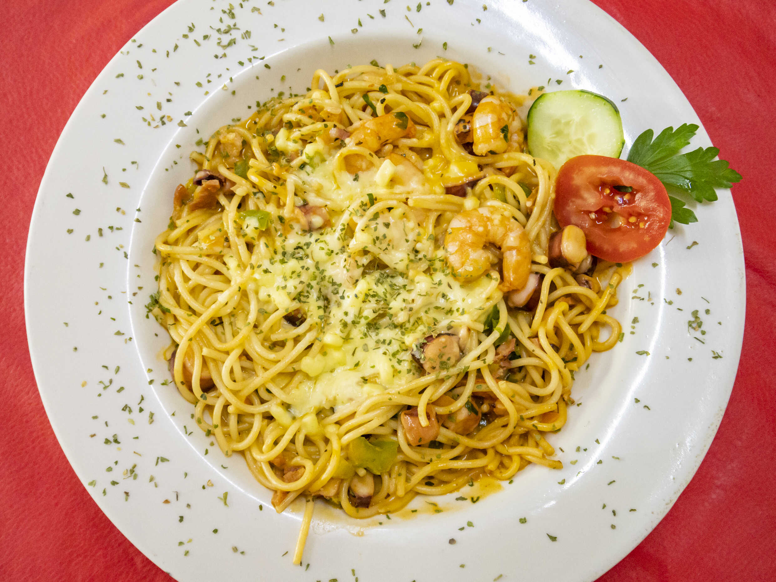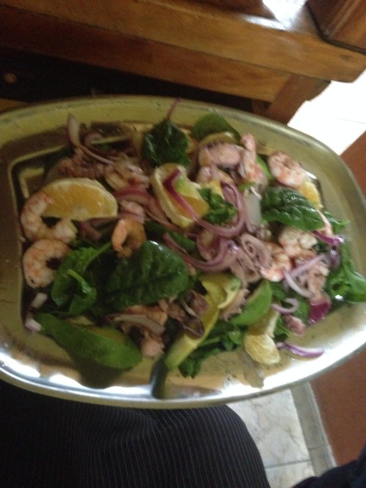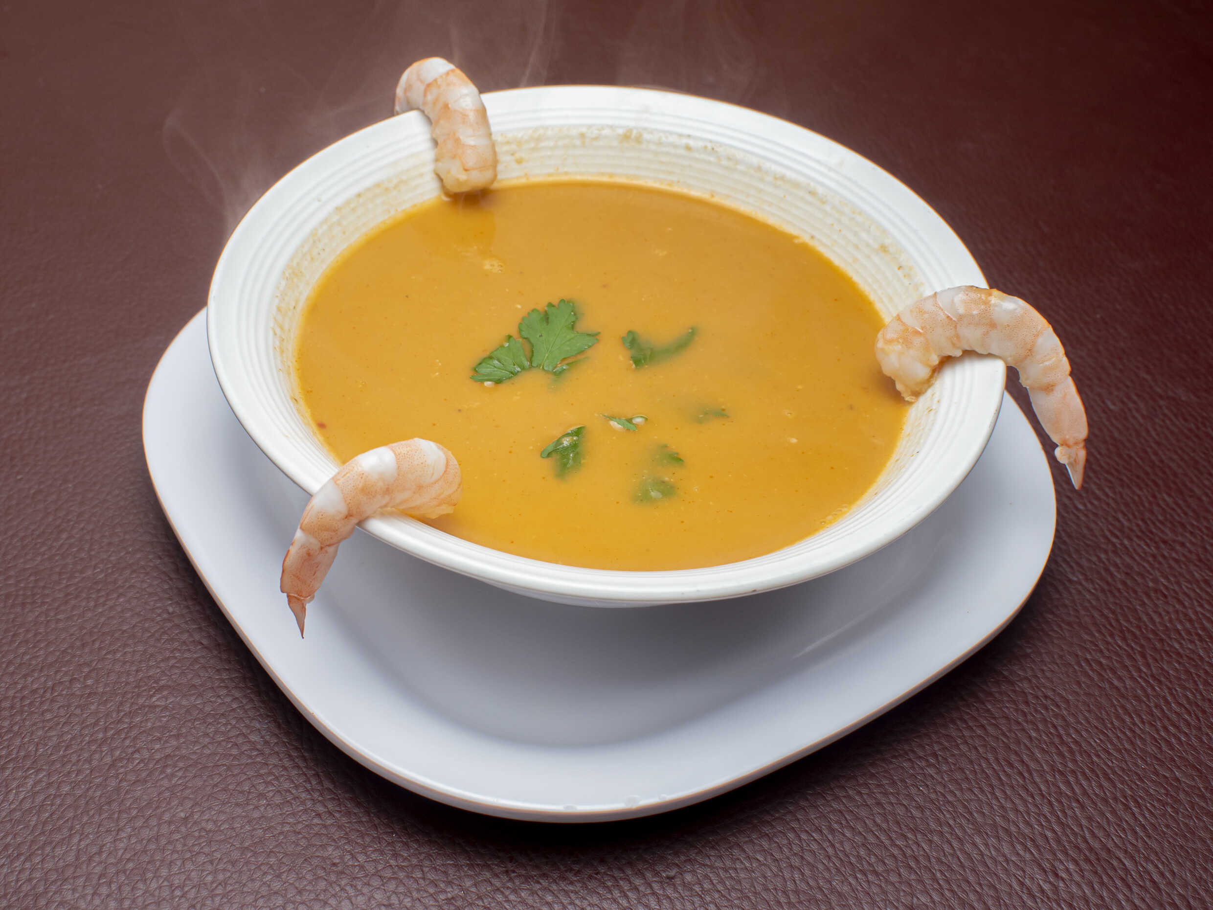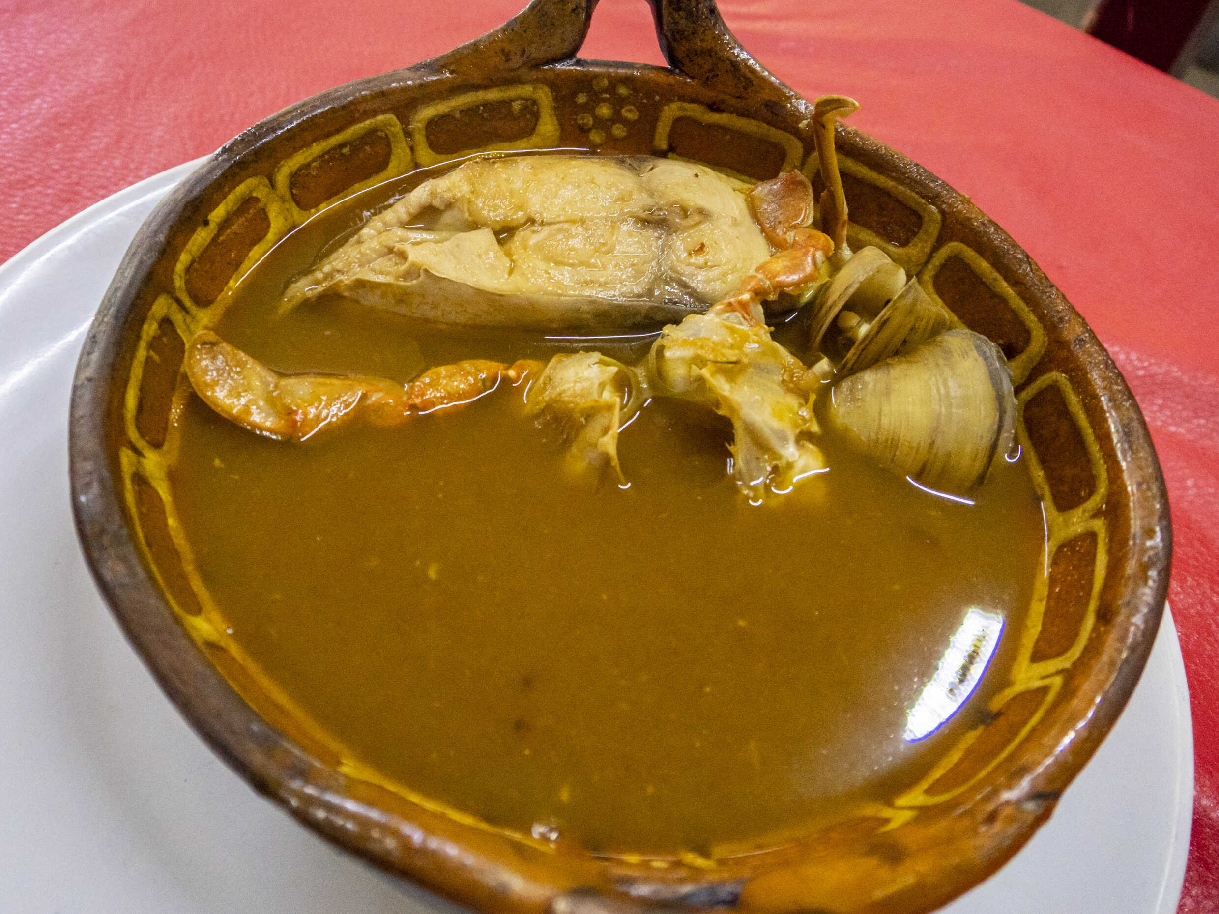 Caldo preparado con mariscos frescos acompañado de verduras y especias.