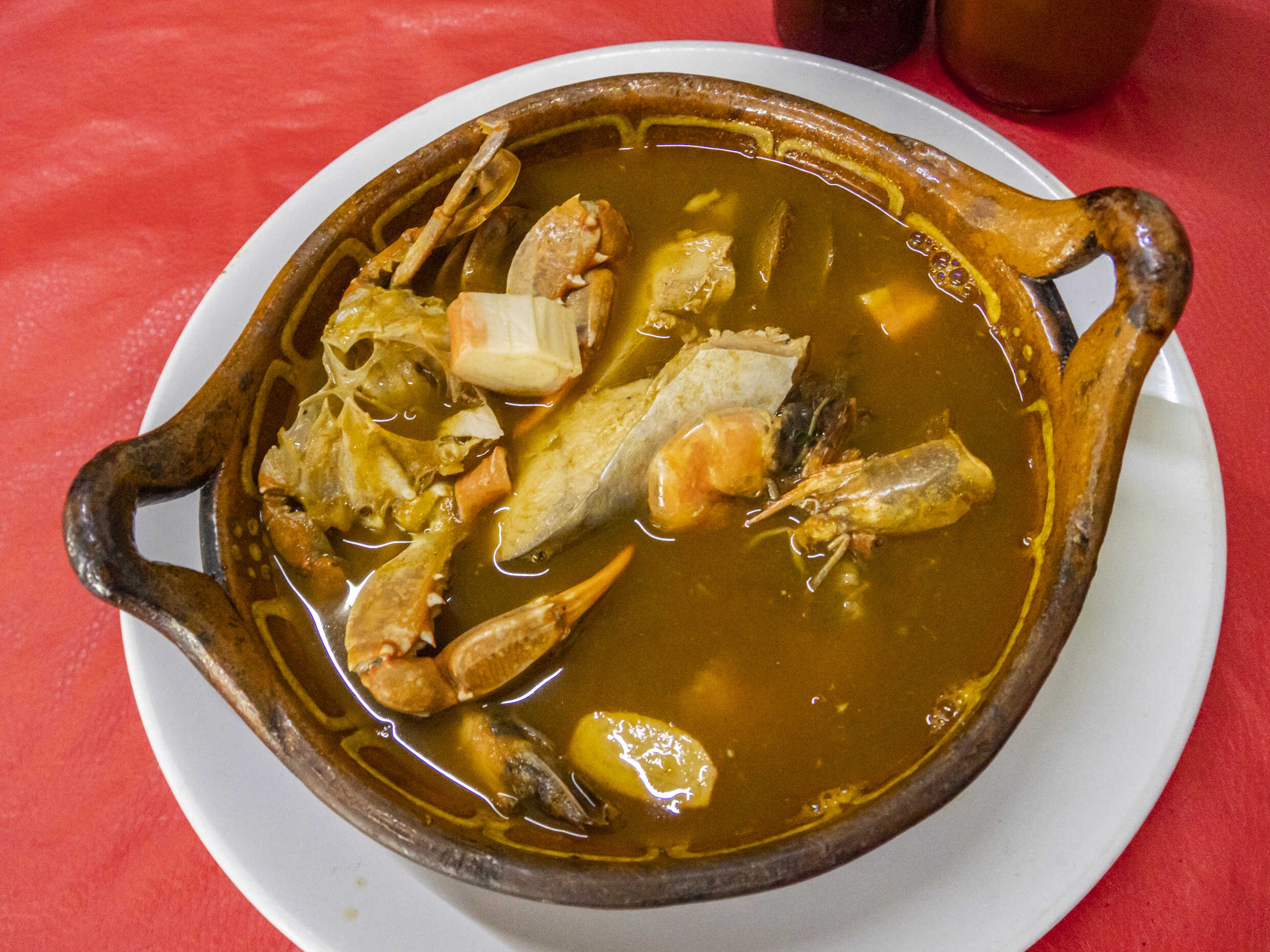 Sopa de mariscos de medio litro, contiene 5 almejas un pedazo de pescado, una jaiba, 3 camarones, pulpo y surimi con 1 pieza de bolillo.