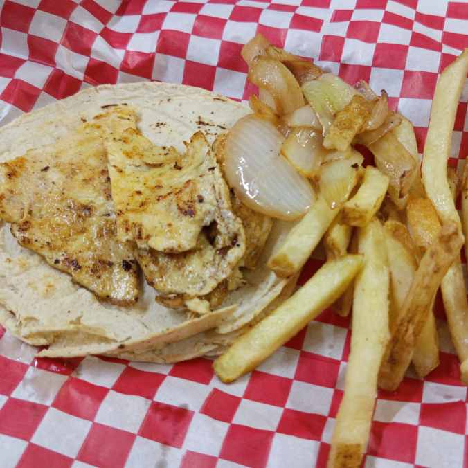 Pechuga asada a la plancha con un toque de ajo molido acompañada de papas a la francesa ,chile toreado y cebollas asadas