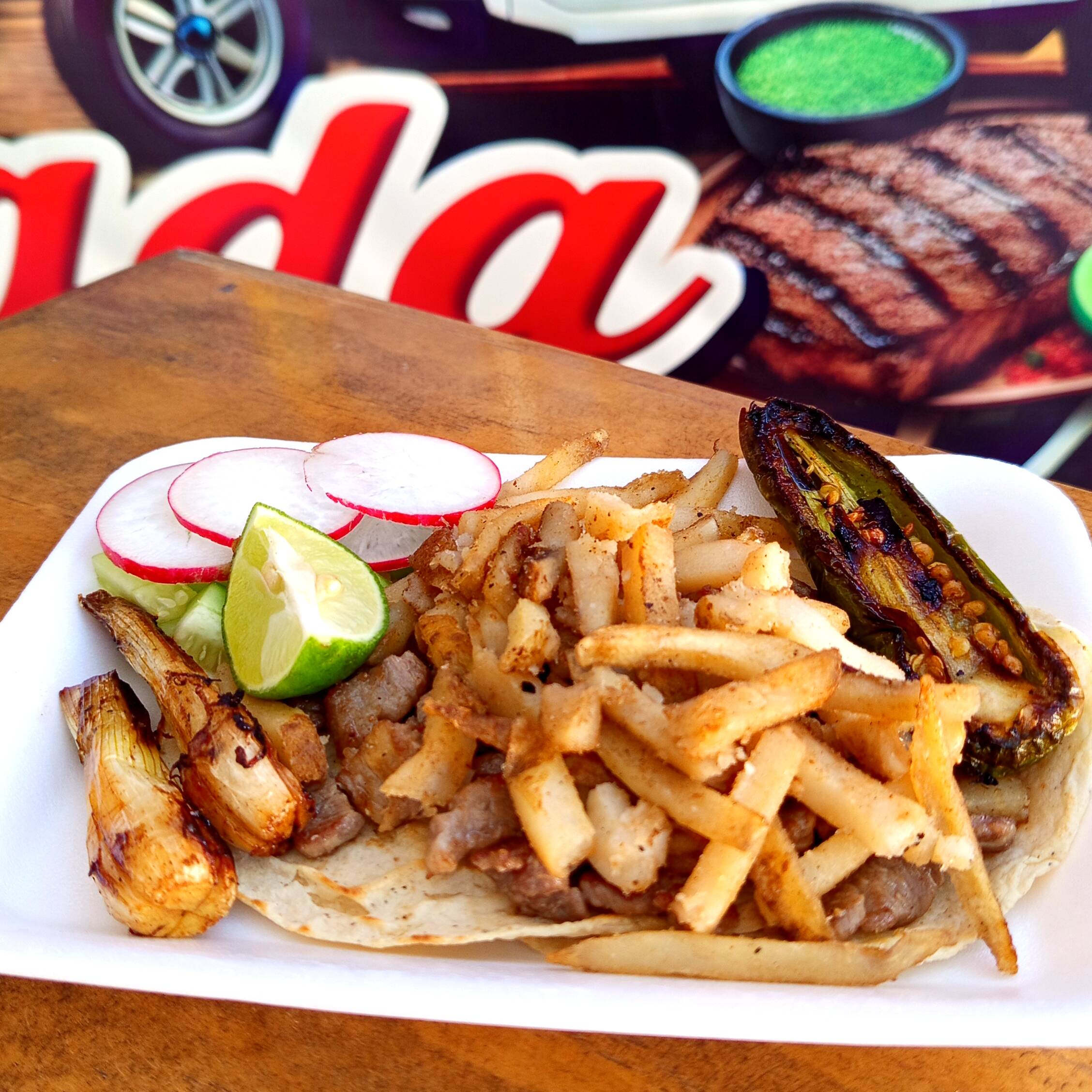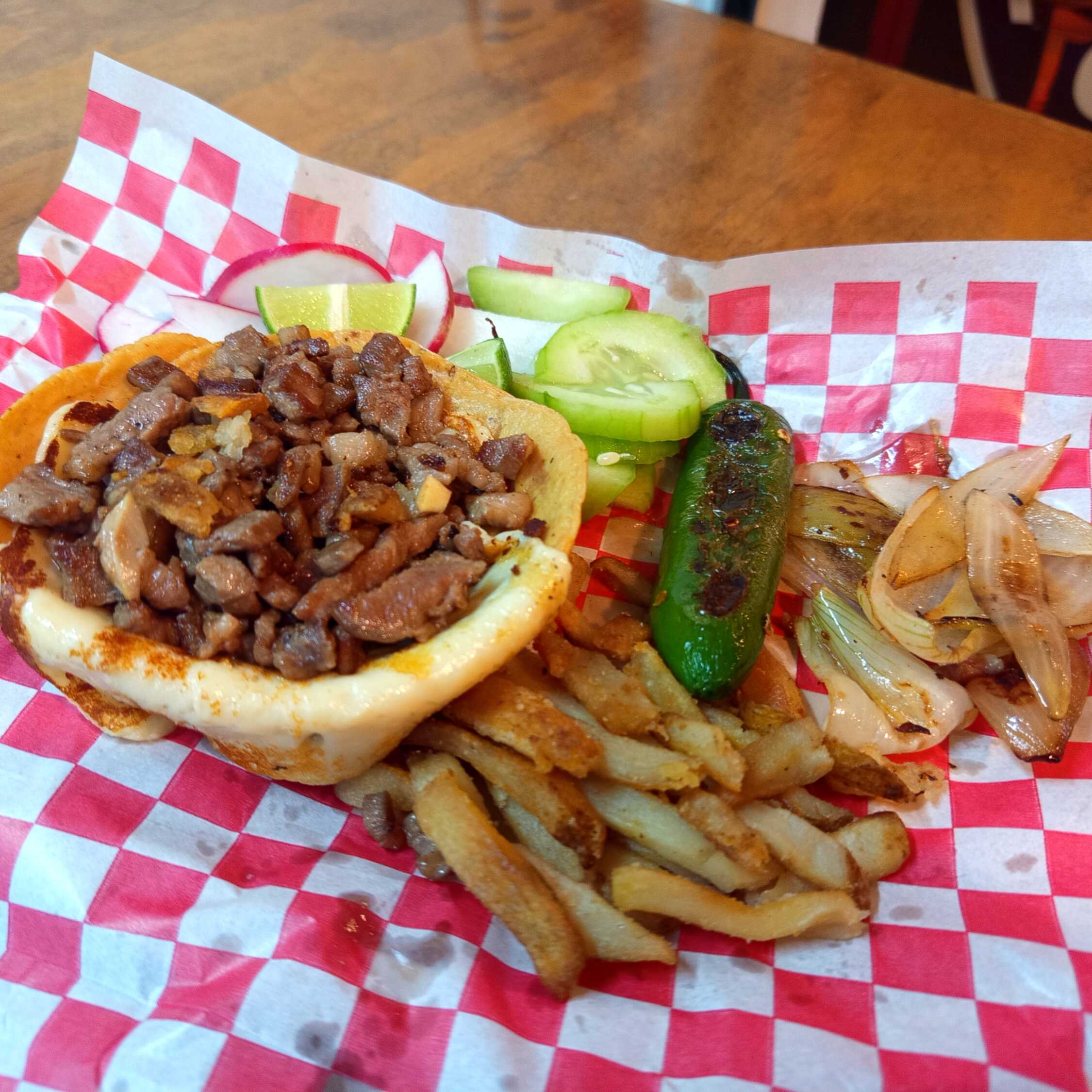 Delicioso Taco de Arrachera de res (100 grs) acompañado con papas a la francesa chiles toreados y cebollas asadas