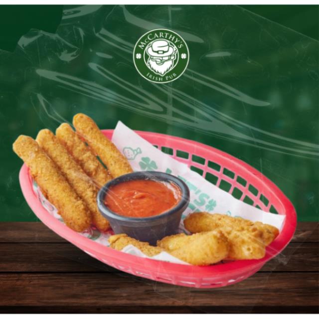 8 DEDOS DE QUESO MOZZARELLA ACOMPAÑADOS CON SALSA.