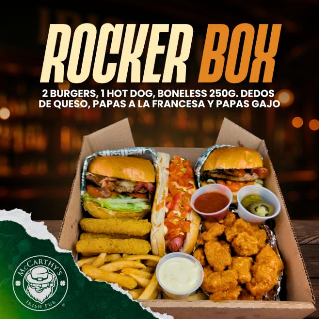 2 BURGERS, 1 HOT DOG, BONELESS 250G, DEDOS DE QUESO, PAPAS A LA FRANCESA Y PAPAS GAJO.