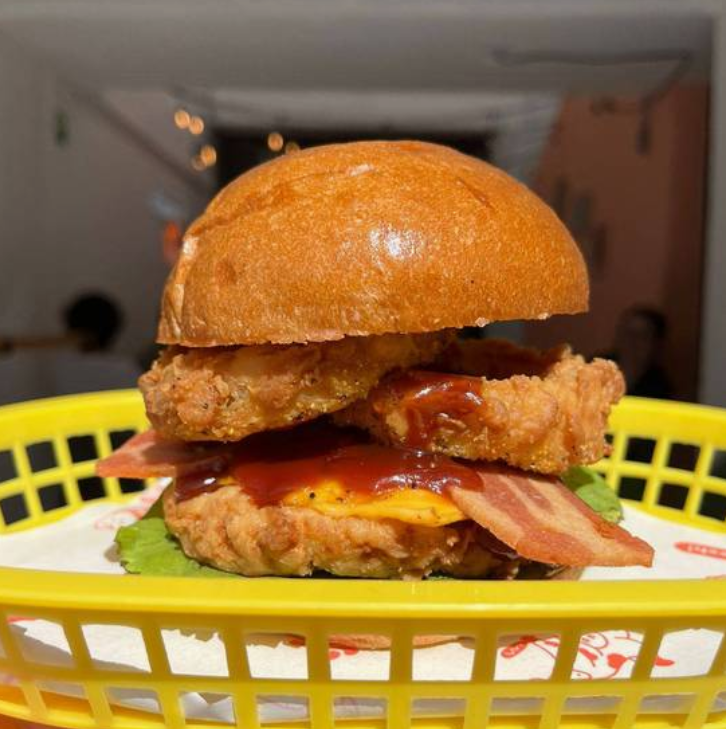 Pan brioche vegano, Pollo frito vegano, mayonesa vegana, queso amarillo vegano, lechuga, aros de cebolla, tocino vegano y BBQ.