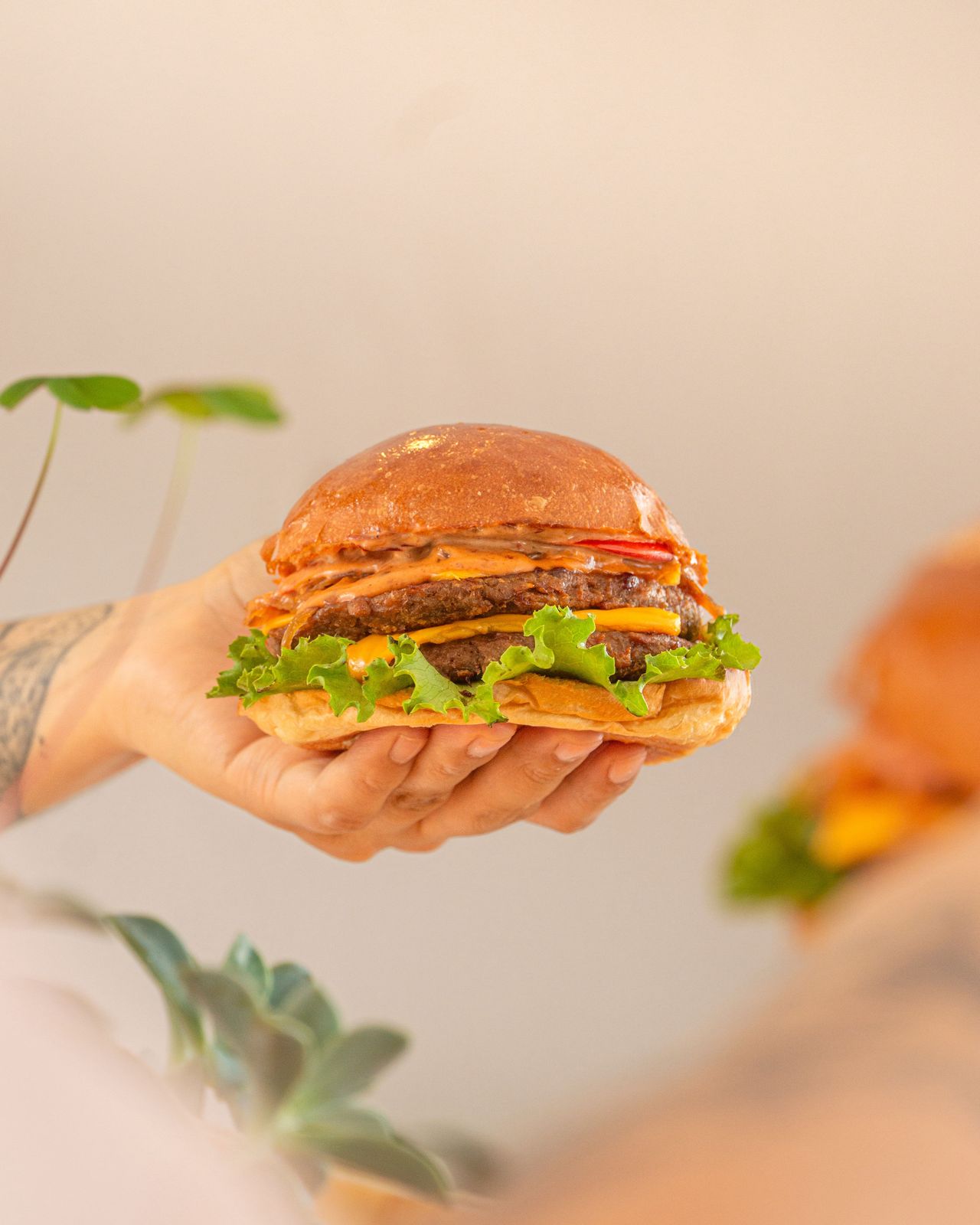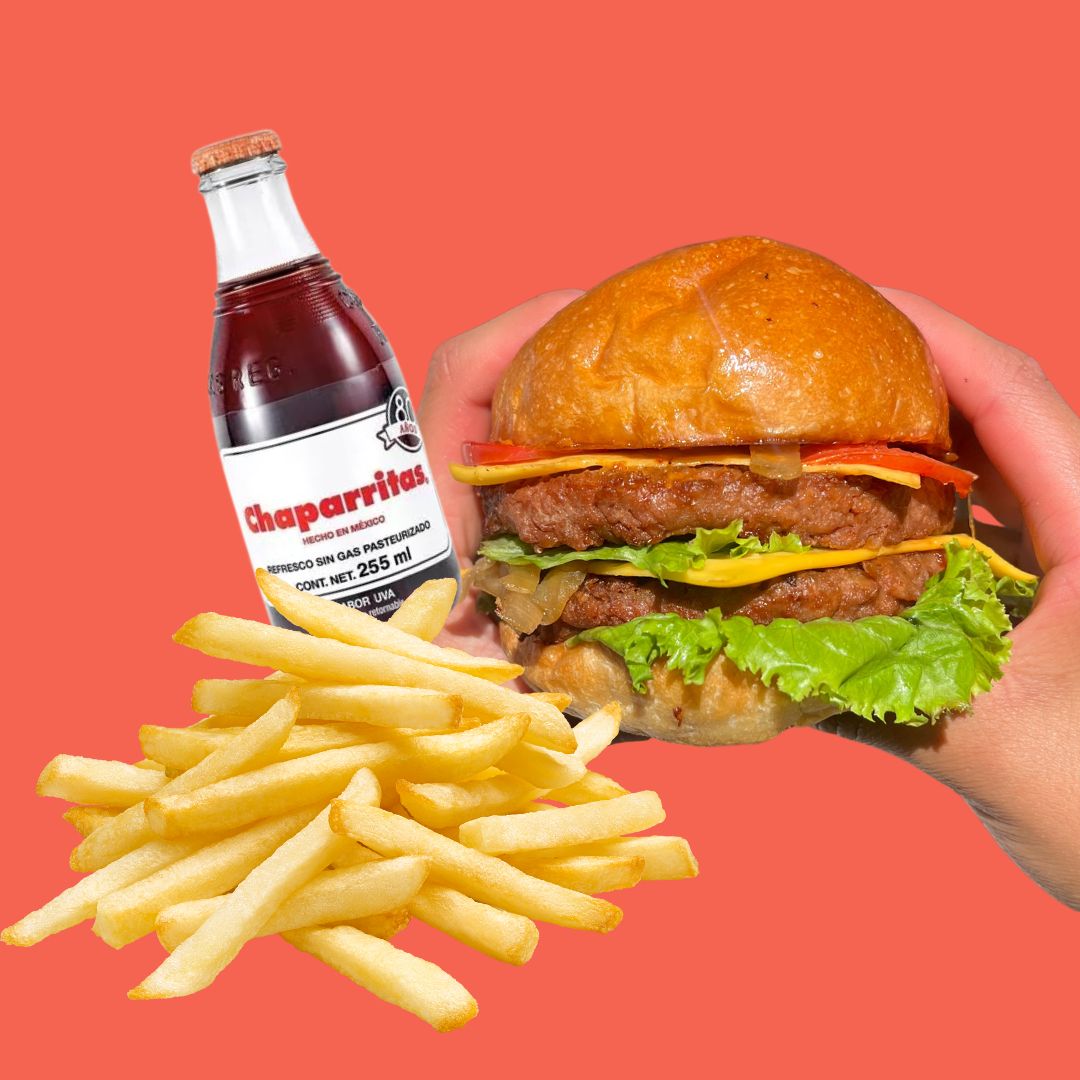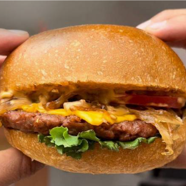 Doble carne vegetal, doble queso vegano, pan brioche vegano, cebolla caramelizada, jitomate, lechuga, aderezo de mayonesa vegana con chipotle.