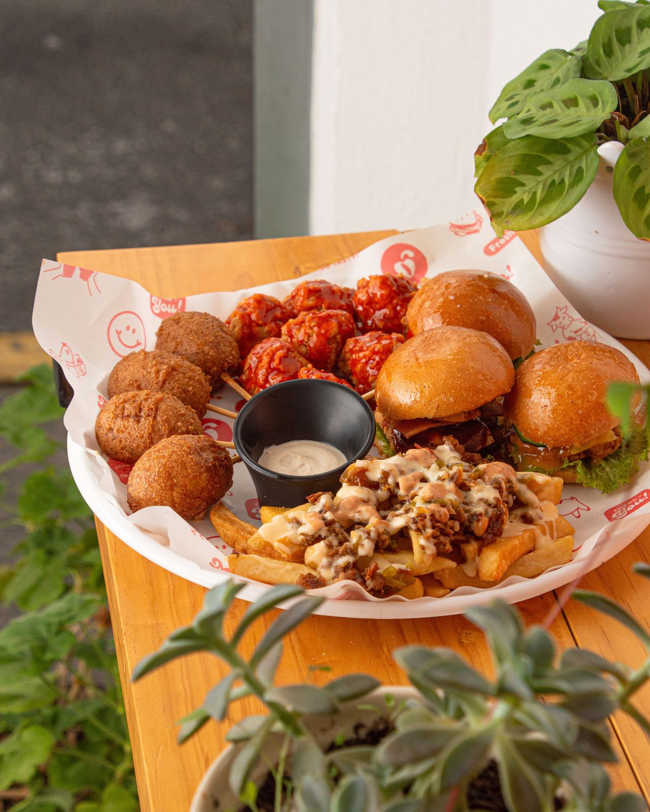 Cuenta con 6 mini banderillas, 12 boneless coliflor BBQ y papas búfalo.