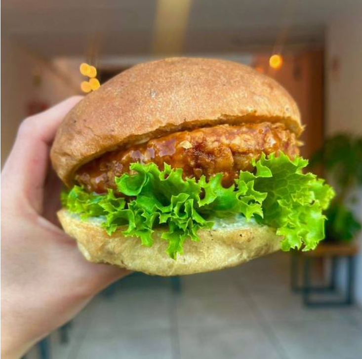 Carne vegetal, lechuga, jitomate, cebolla caramelizada, mostaza, mayonesa con chipotle, queso vegano y pan brioche.