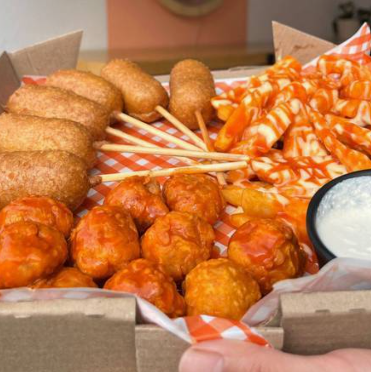 Cuenta con 6 mini banderillas, 12 boneless coliflor búfalo y papas búfalo.