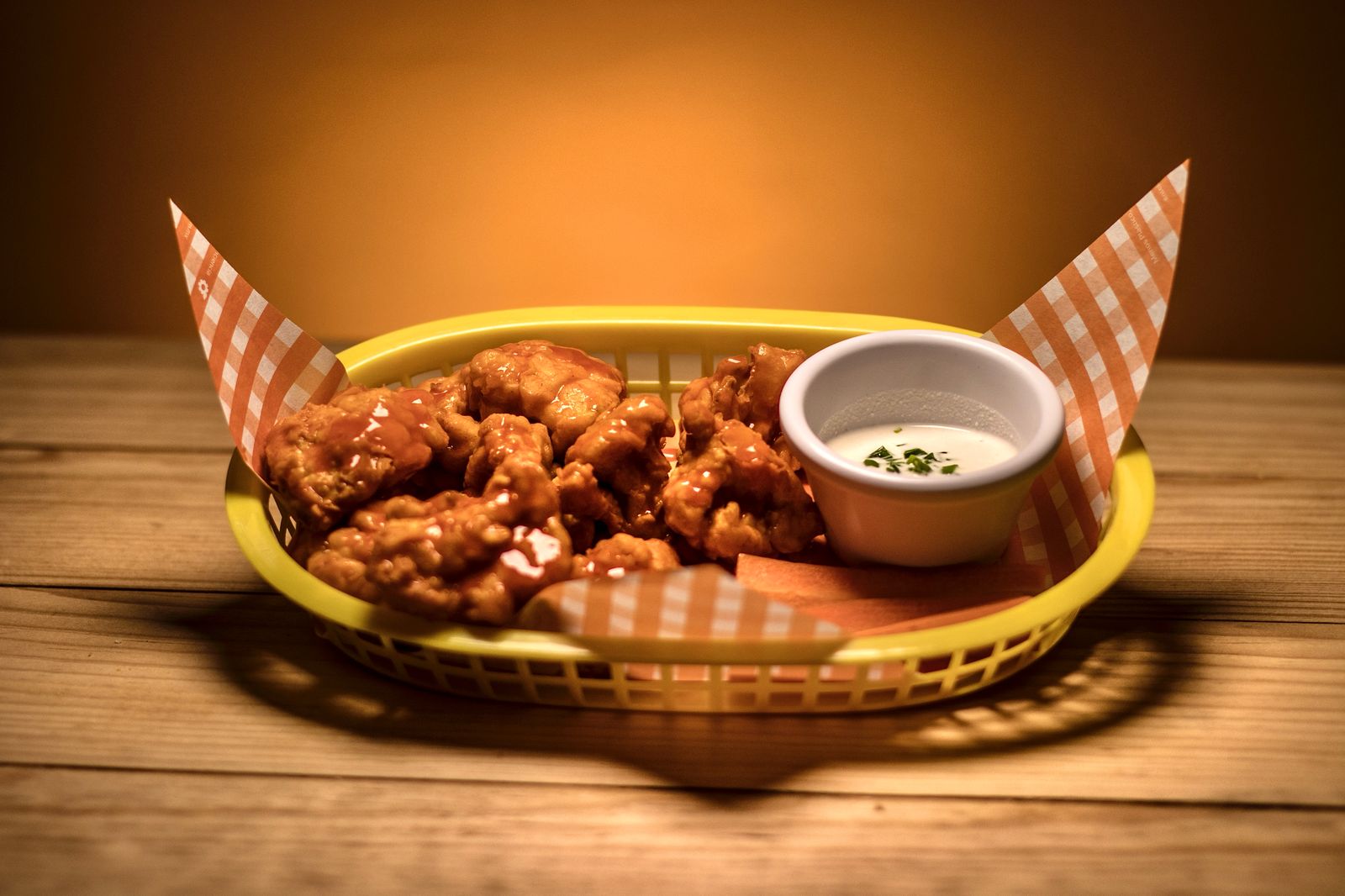 Coliflor frita, bañadas en salsa BBQ, acompañadas de salsa ranch vegana y zanahorias.