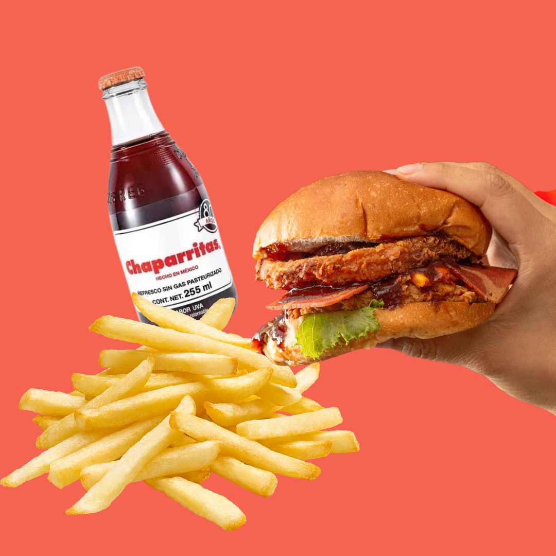 Meloburguer clásica, papas chicas y chaparrita.
