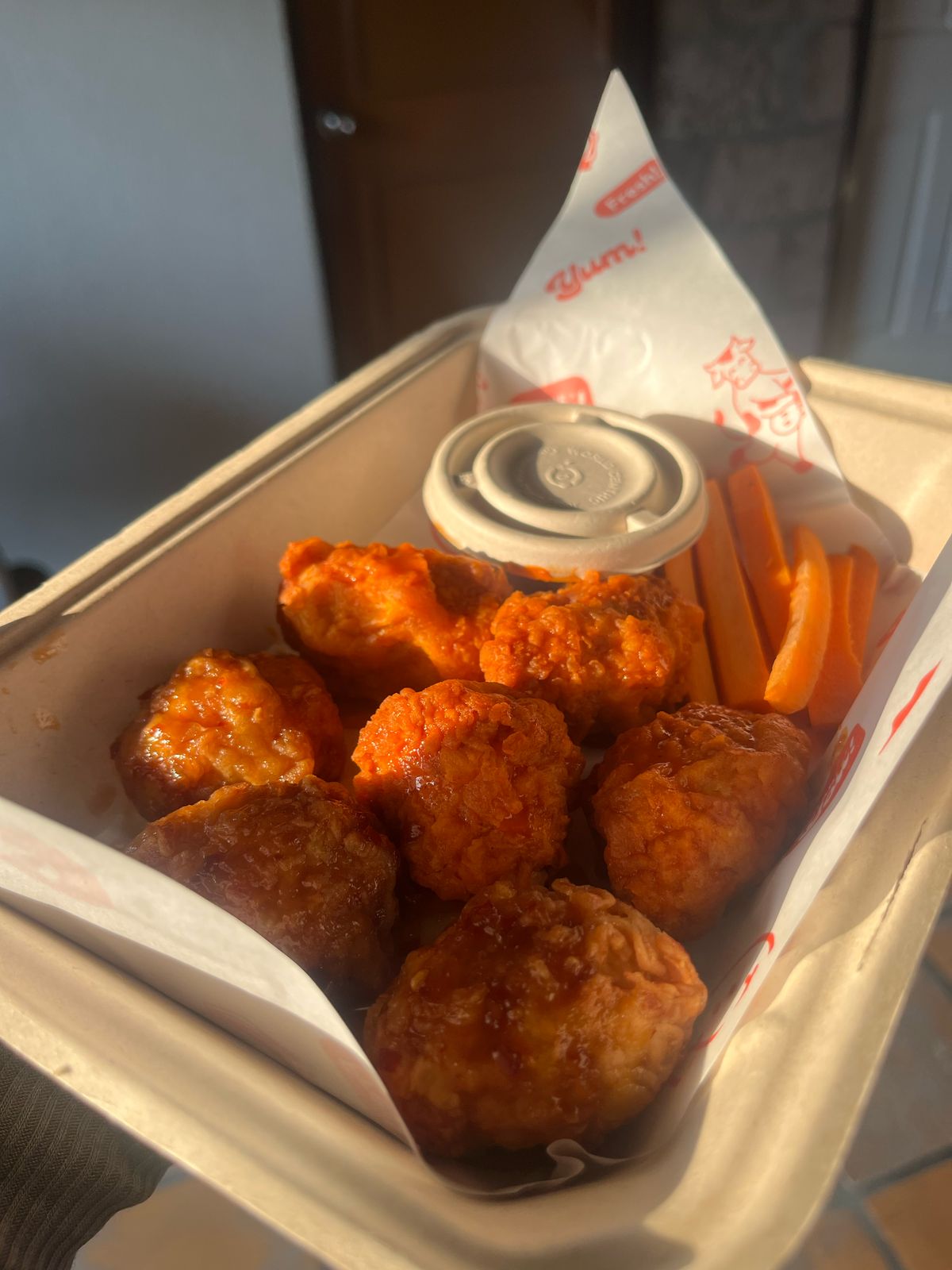 Cuenta con 6 mini banderillas, 12 boneless Pollo Melocotón y papas búfalo.