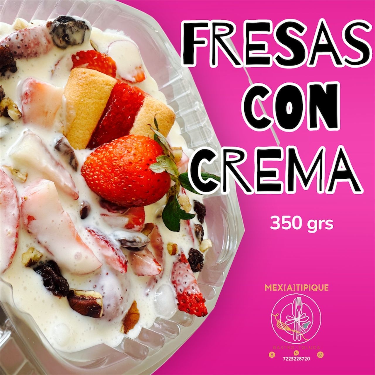 Fresas naturales y desinfectadas, en la crema de la casa, a base de leche condensada, evaporada, queso crema, crema para batir, un toque dd vainilla y canela, y con un poco de nuez y pasas.
