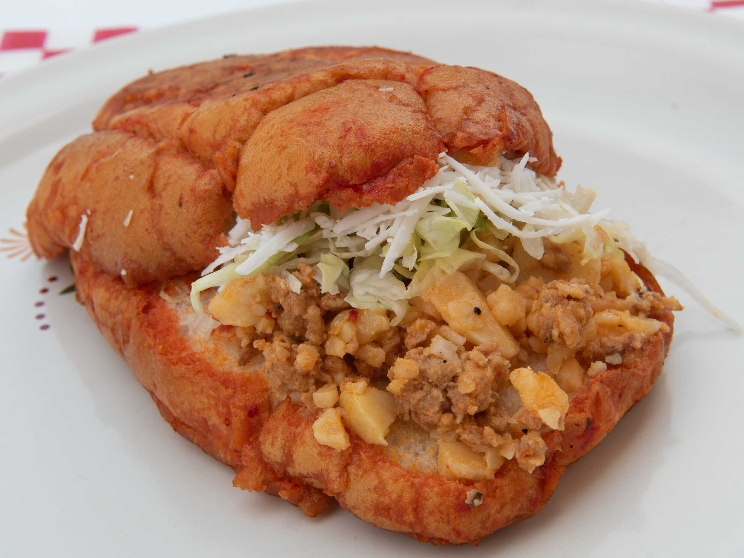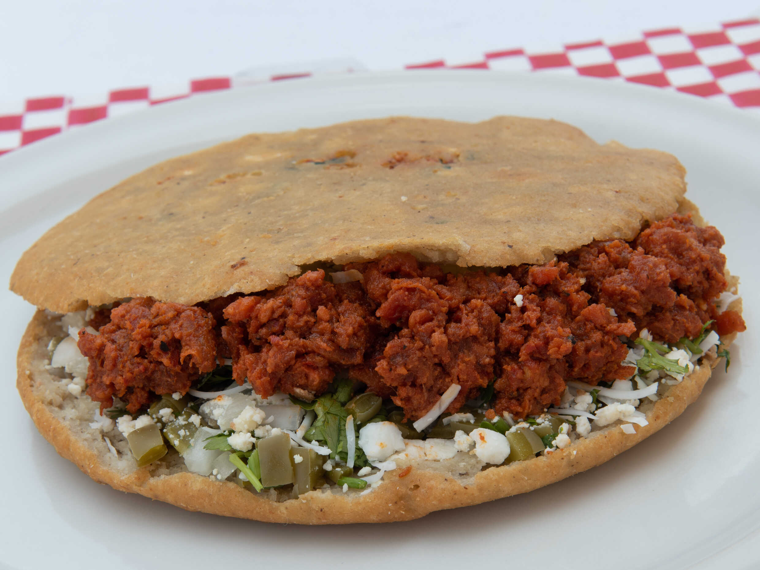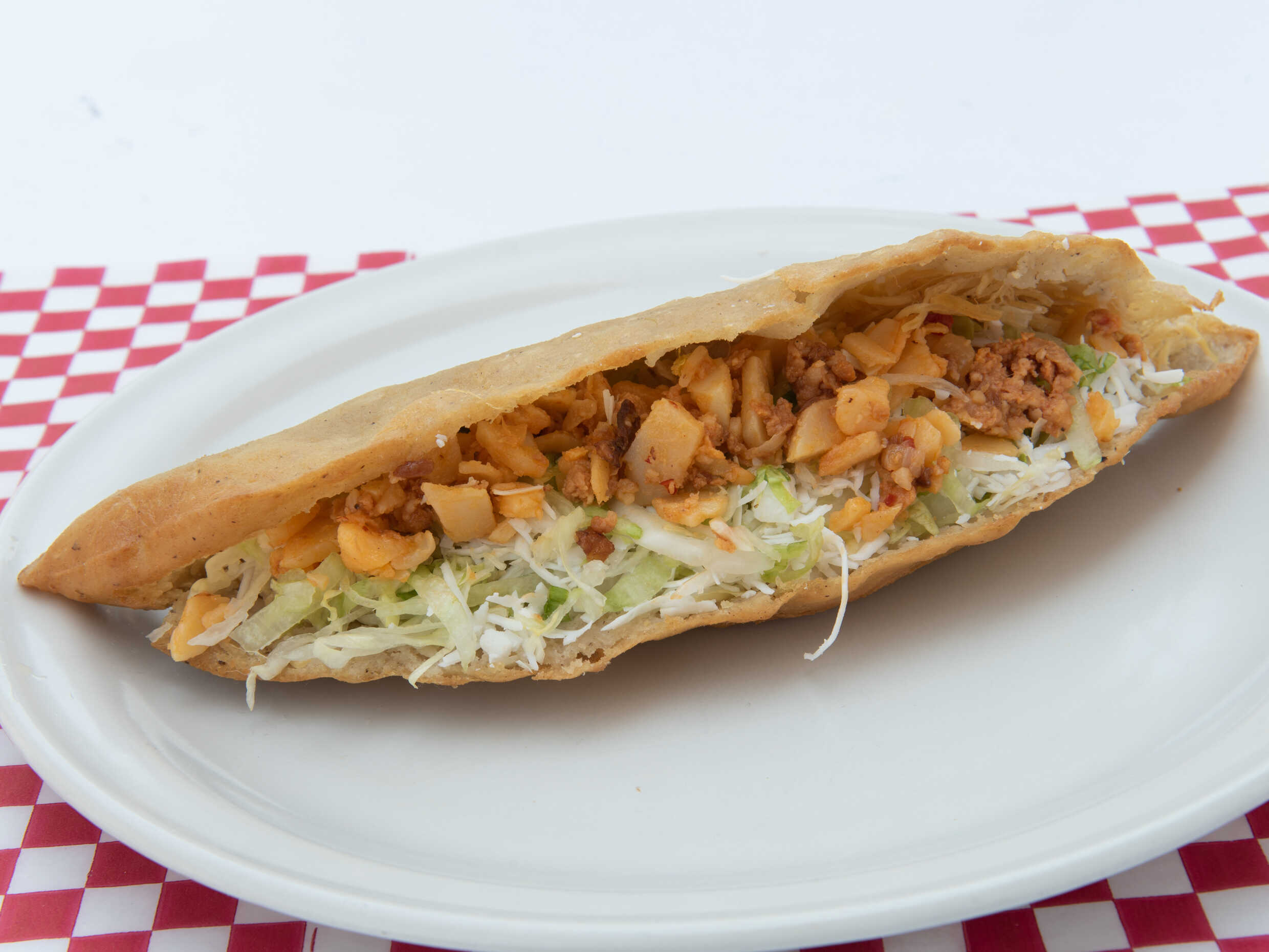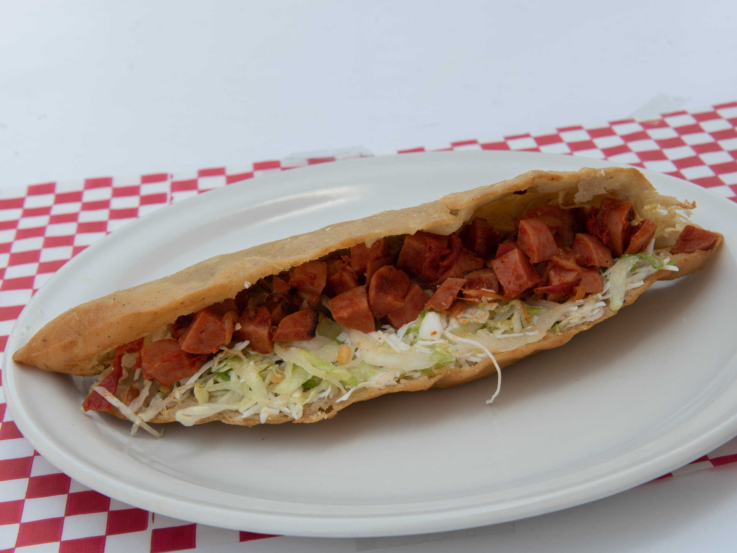 Pambazo enchilado con huajillo, Papas con longaniza, lechuga, queso y crema