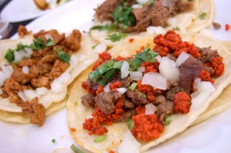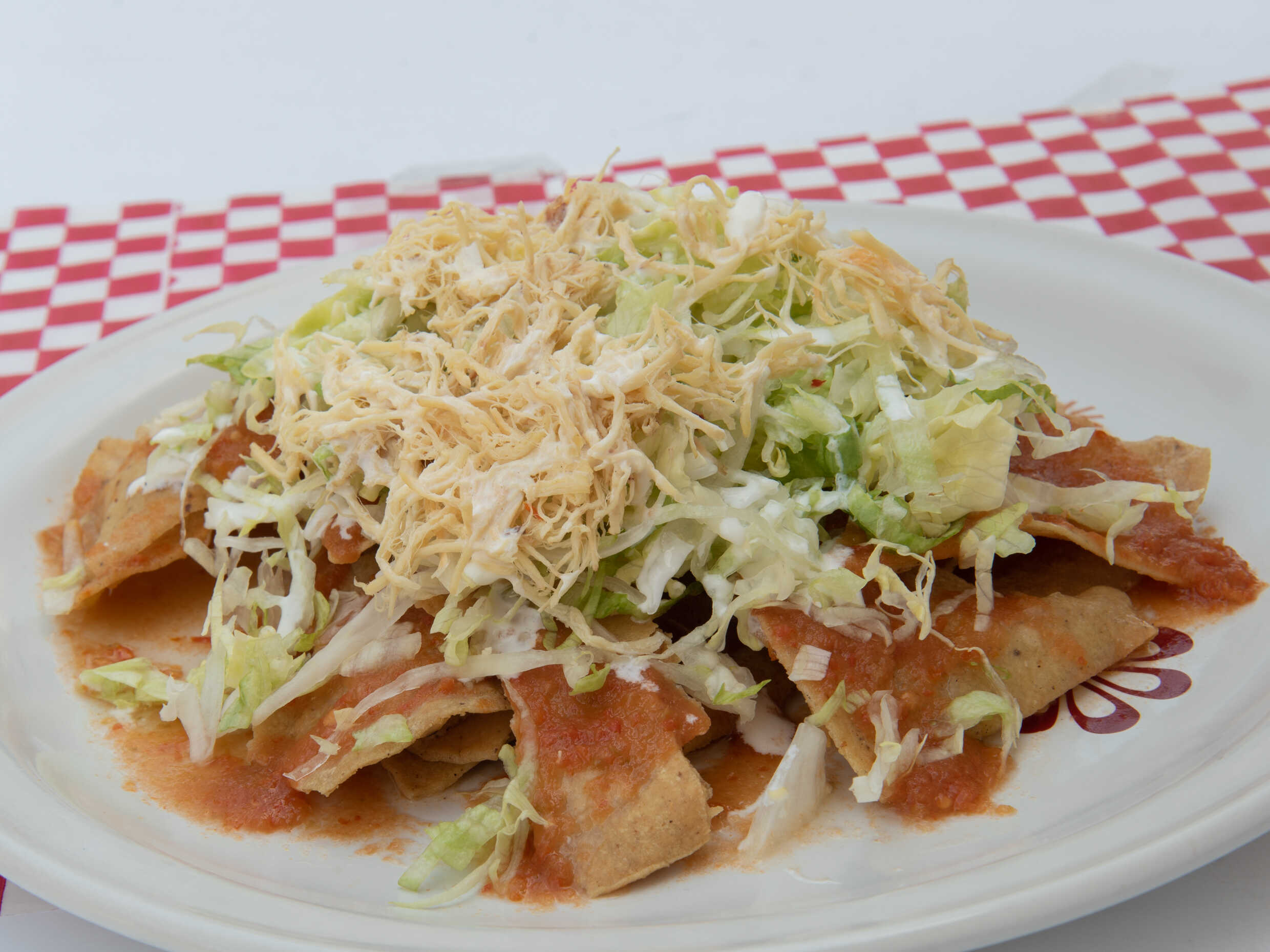Tortillas doradas con salsa, pollo, lechuga, queso y crema.