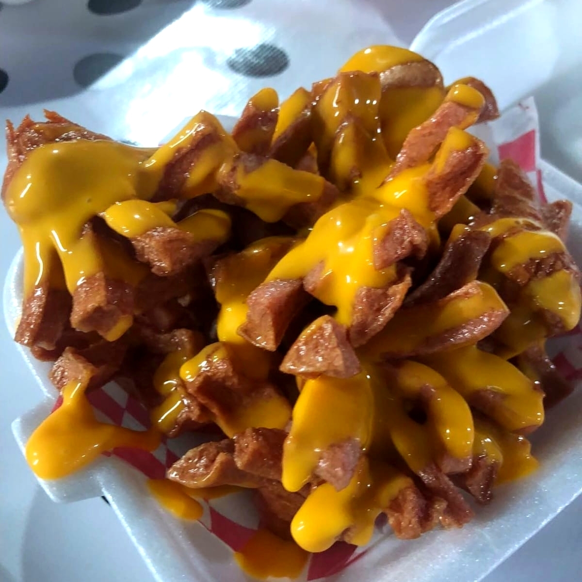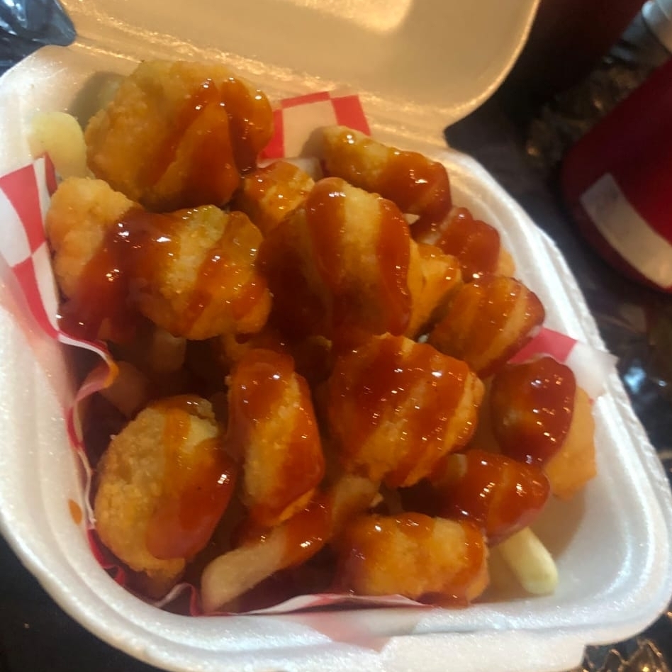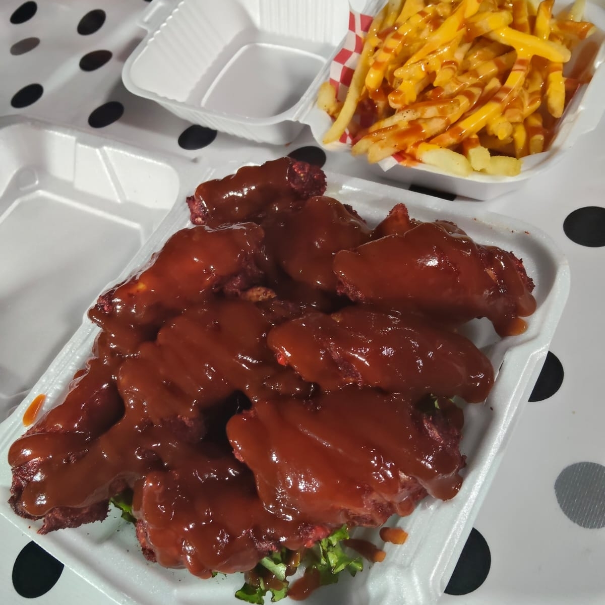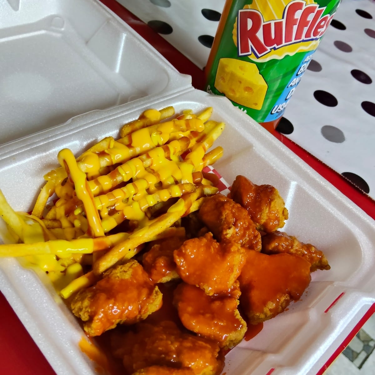 250 gr de palomitas de pollo y papas a la francesa. Bañados con la salsa de tu elección.