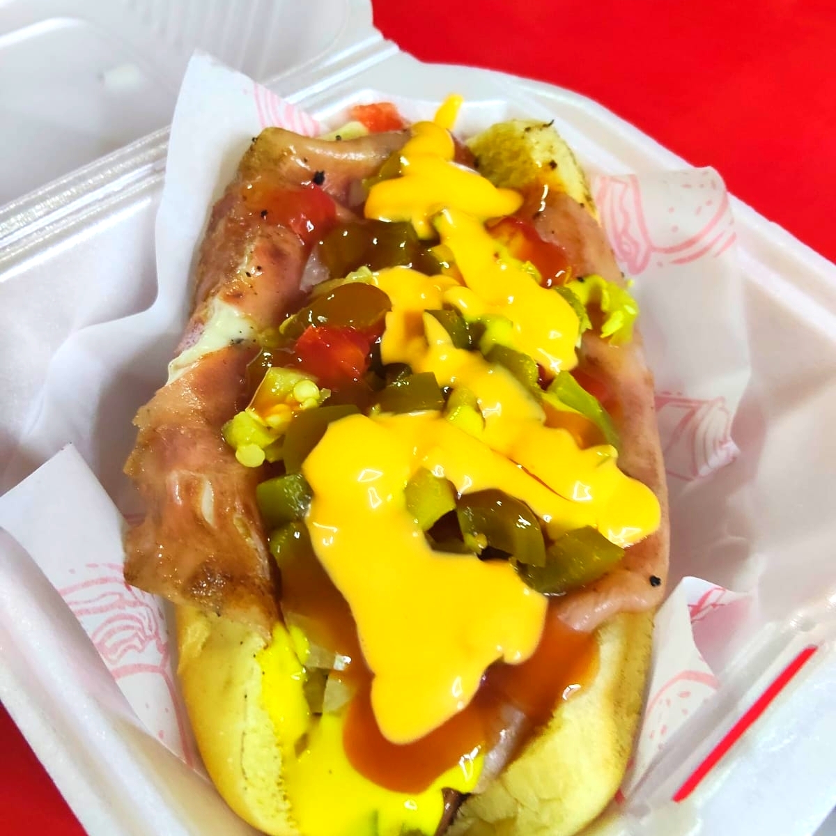 Carne 100% natural, queso Oaxaca, queso amarillo, salchicha, jamón y tocino.