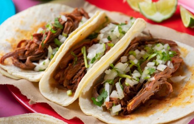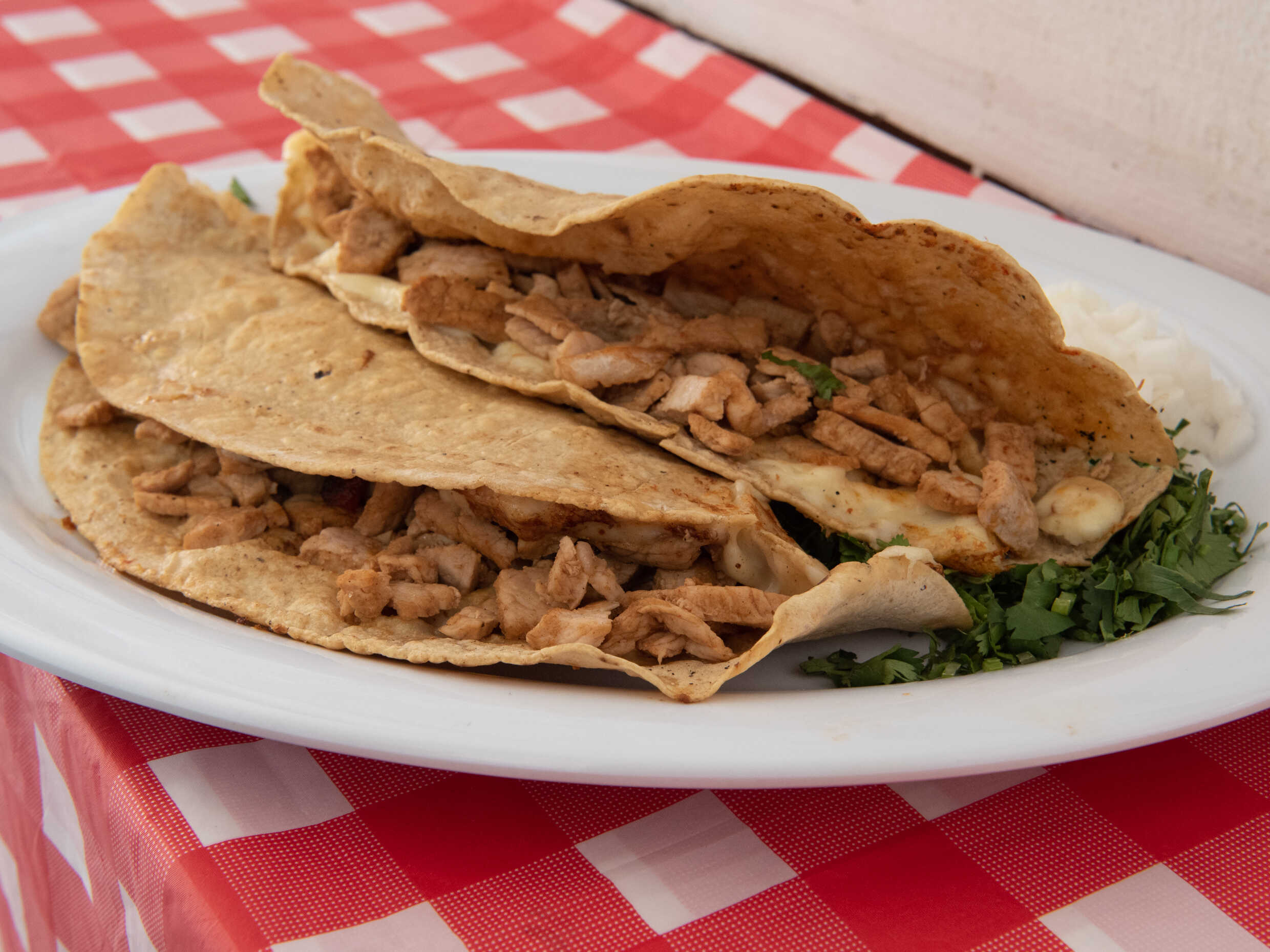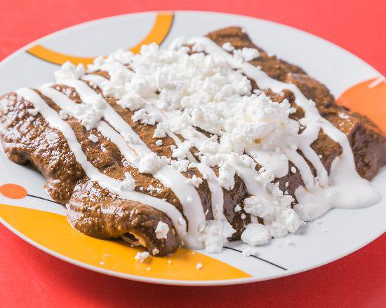 Mole rojo, pollo, queso, crema y cebolla