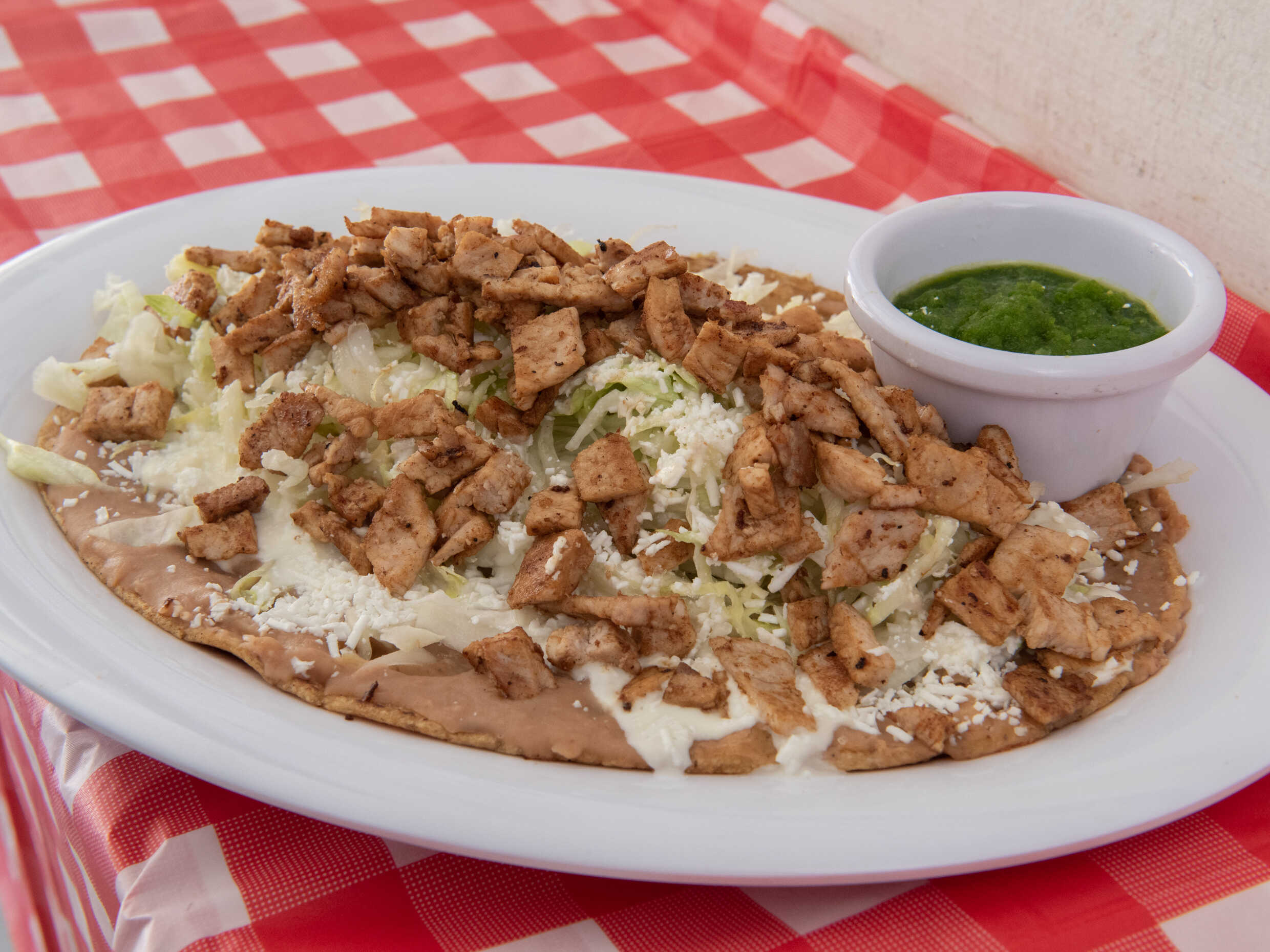 Totopos, lechuga, crema, queso, y milanesa de pollo por encima y salsa aparte