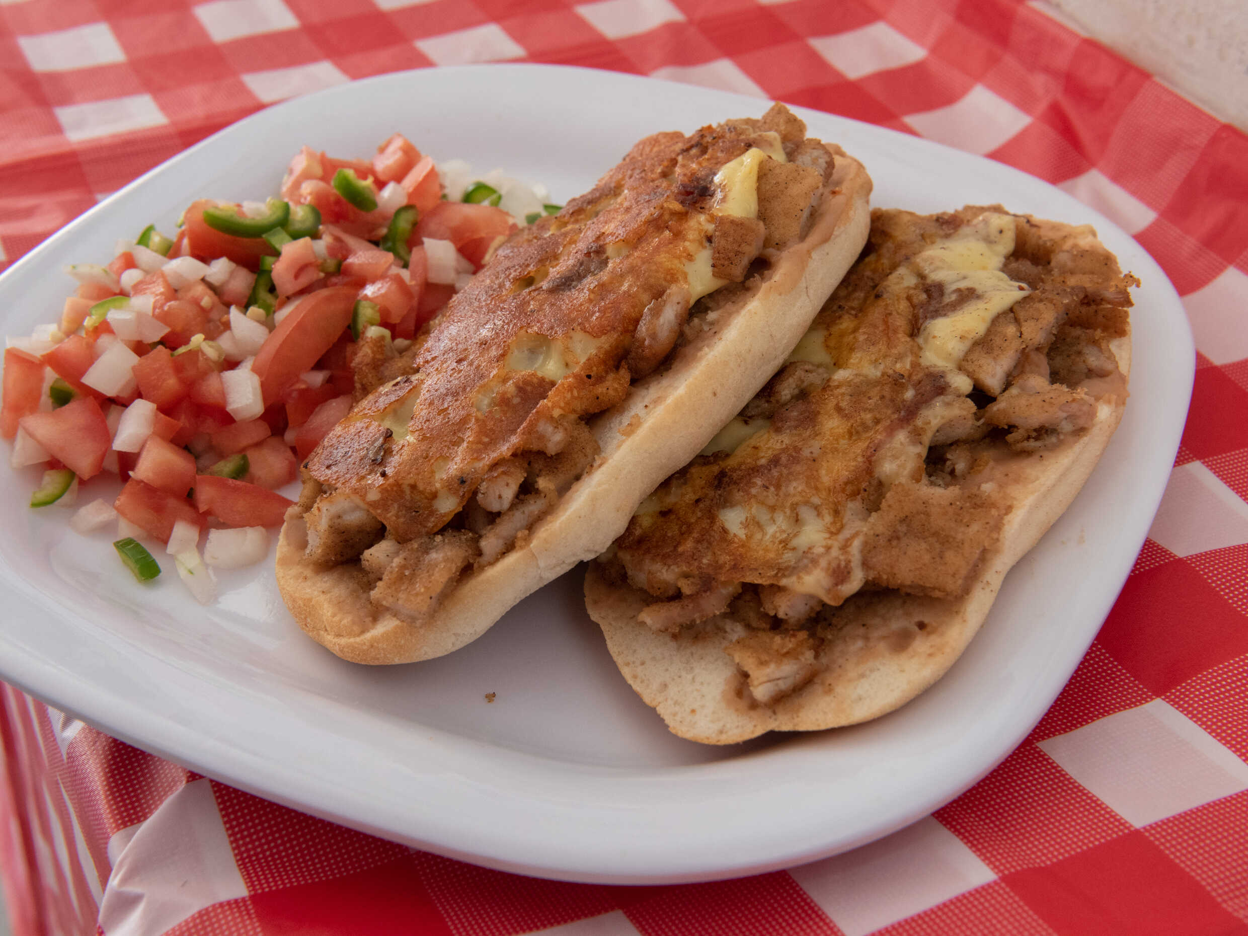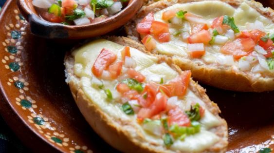 Pan untado en frijol refrito, gratinado con queso manchego acompañado de pico de gallo