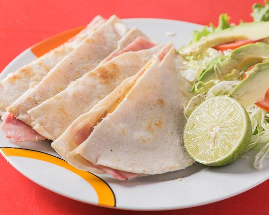 2 piezas de Quesadillas de harina con jamon y queso. Incluye papas y bebida Frutsi