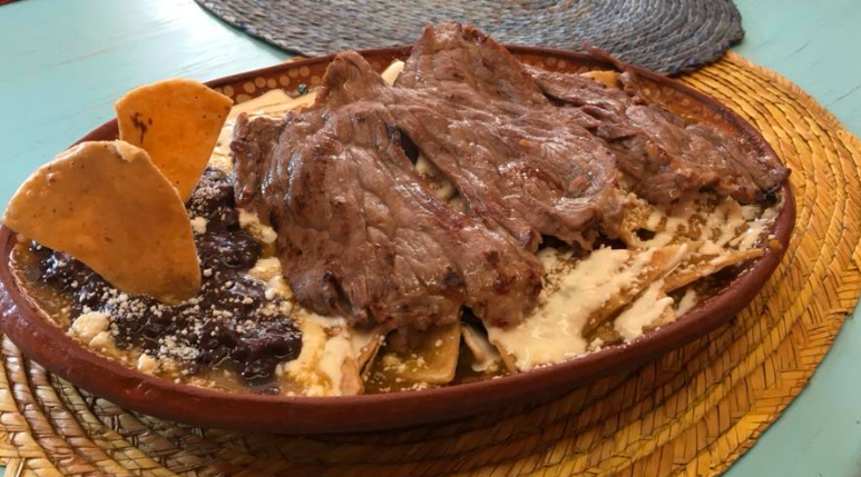 Chilaquiles verdes, servidos con cecina natural acompañados con queso, crema y frijoles