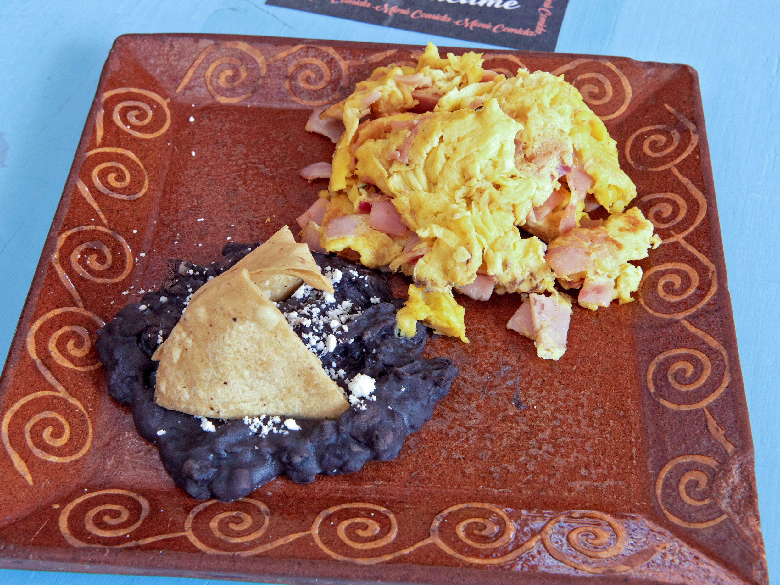 3 piezas de huevo revuelto con jamón, servidos con frijoles negros refritos