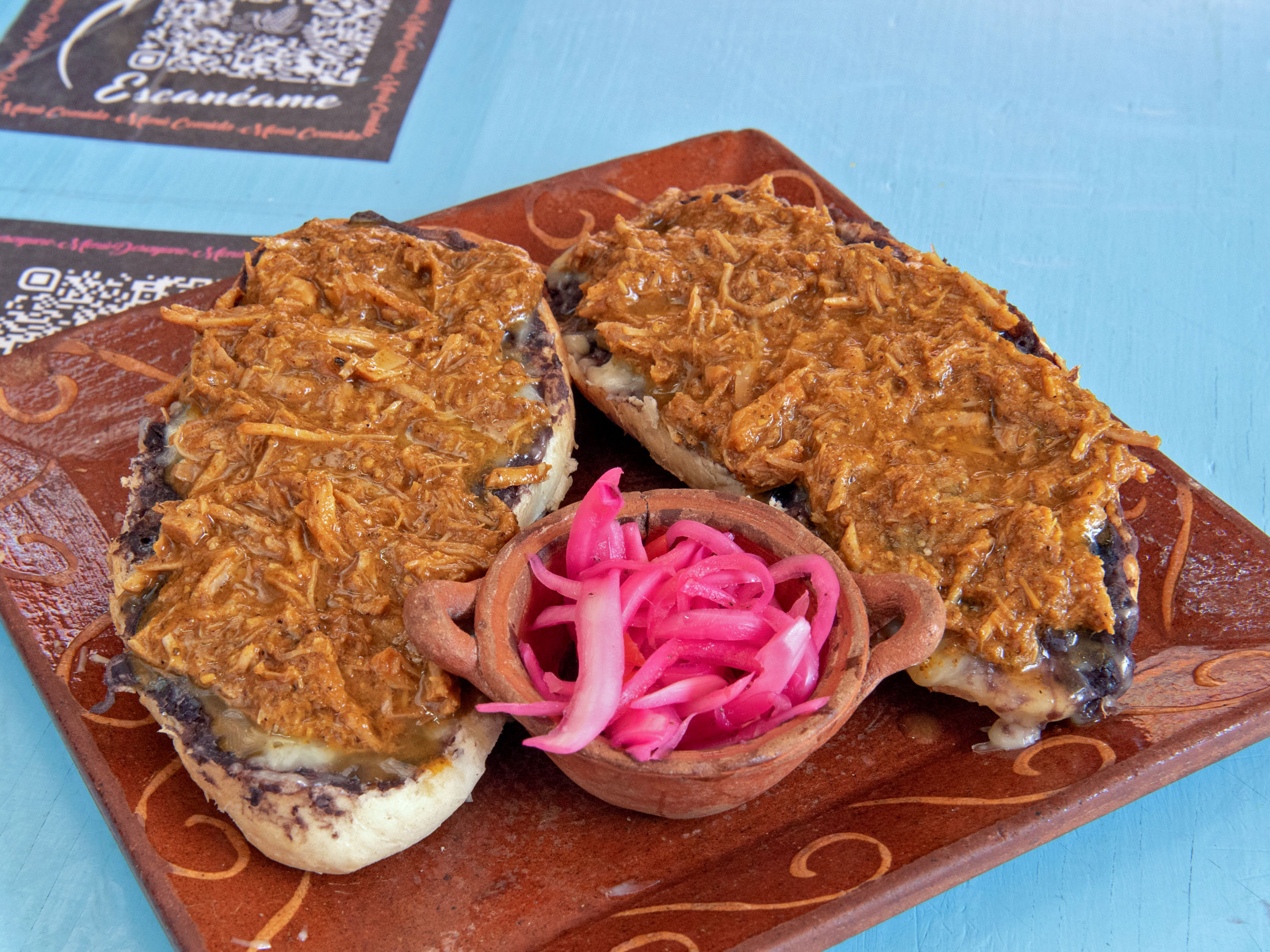 2 Molletes con frijoles, queso manchego gratinado y de cochinita pibil, acompañados de cebolla mora encurtida, pide salsa picante aparte