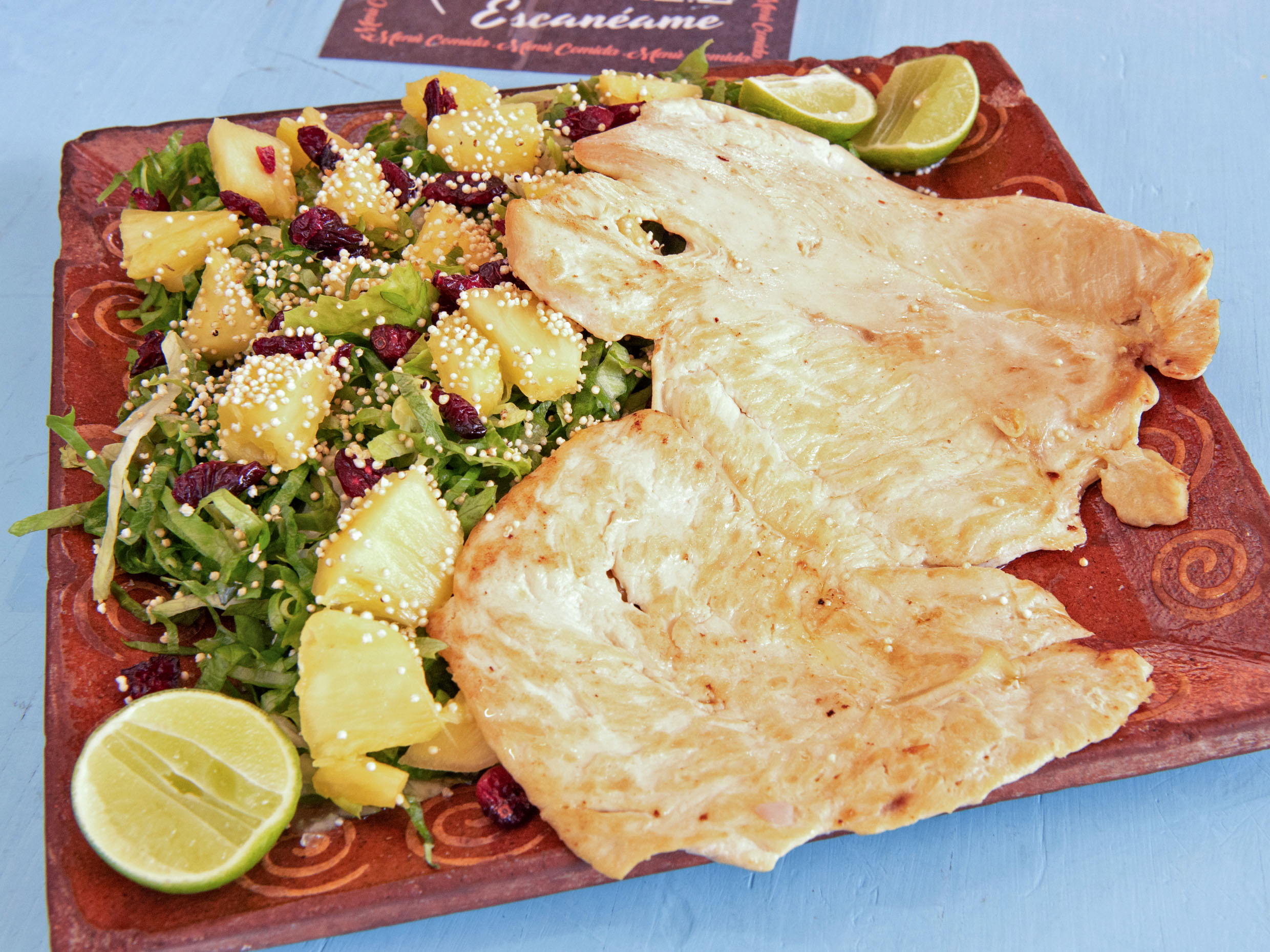 Pechuga de pollo a la plancha servida con ensalada de lechuga, arandano, amaranto y manzana