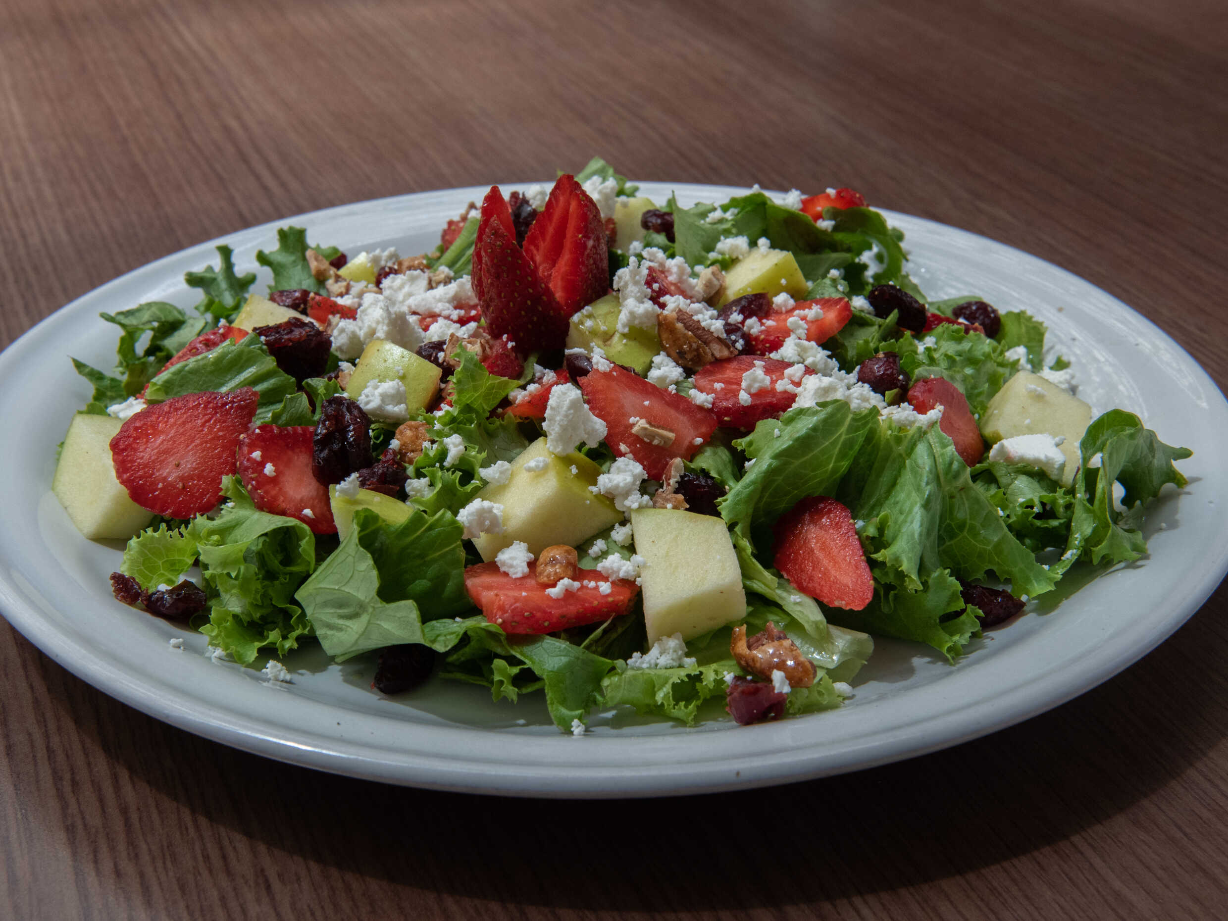 Lechuga, fresa, manzana verde, nuez garapiñada, arándano, queso de cabra, acompañado con aderezo de mostaza con miel.