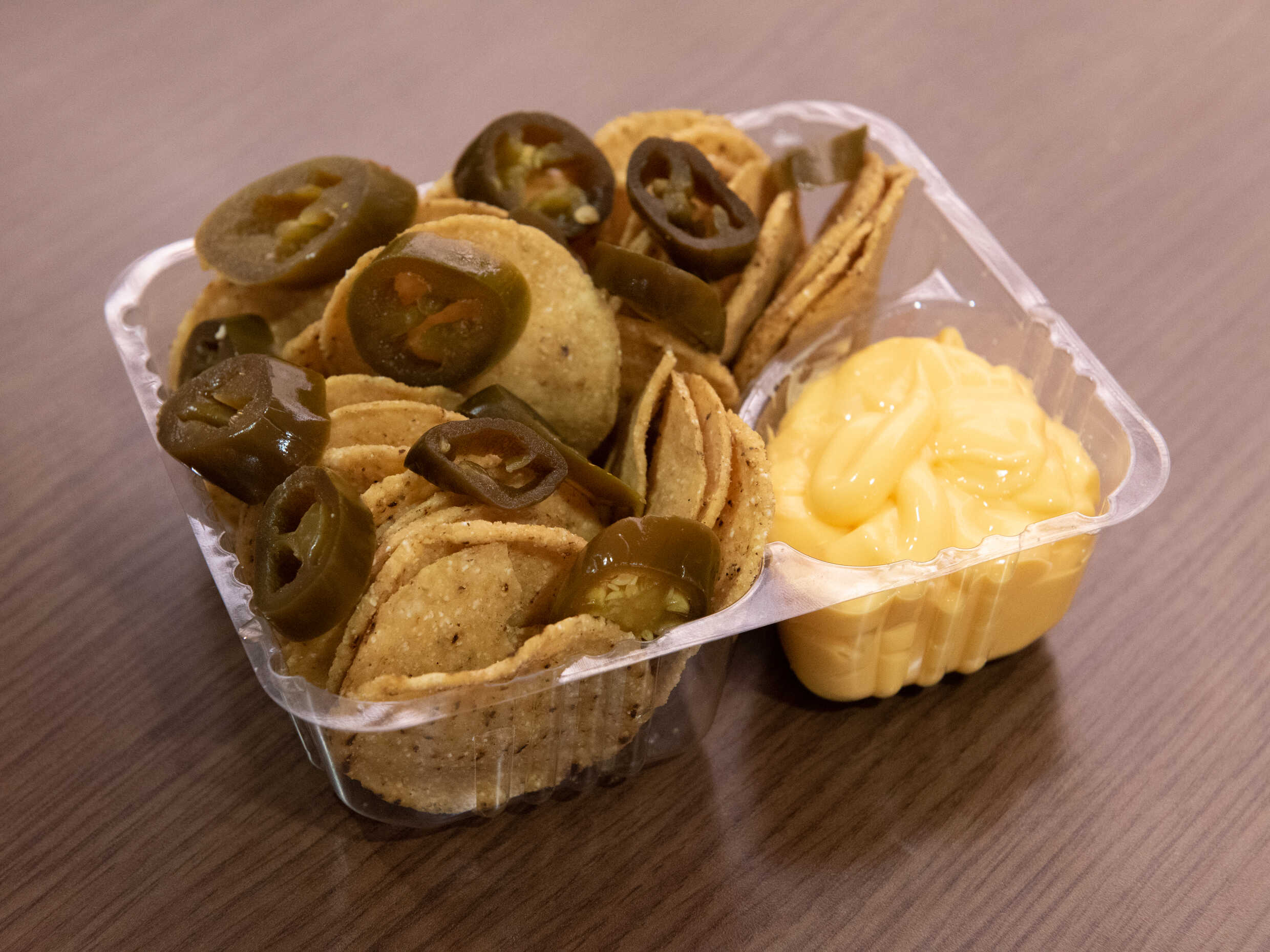 Crujiente nacho tradicional con queso amarillo y jalapeños.