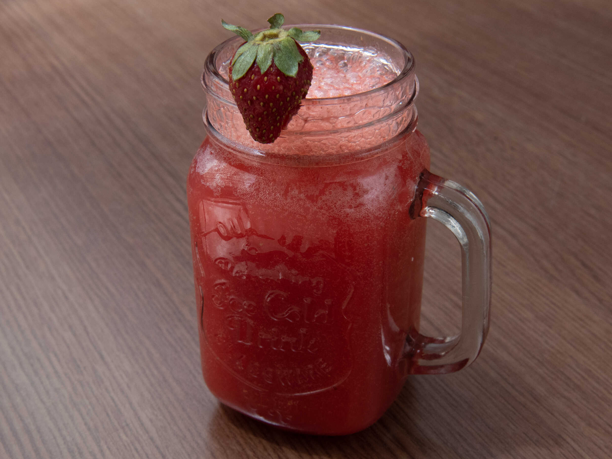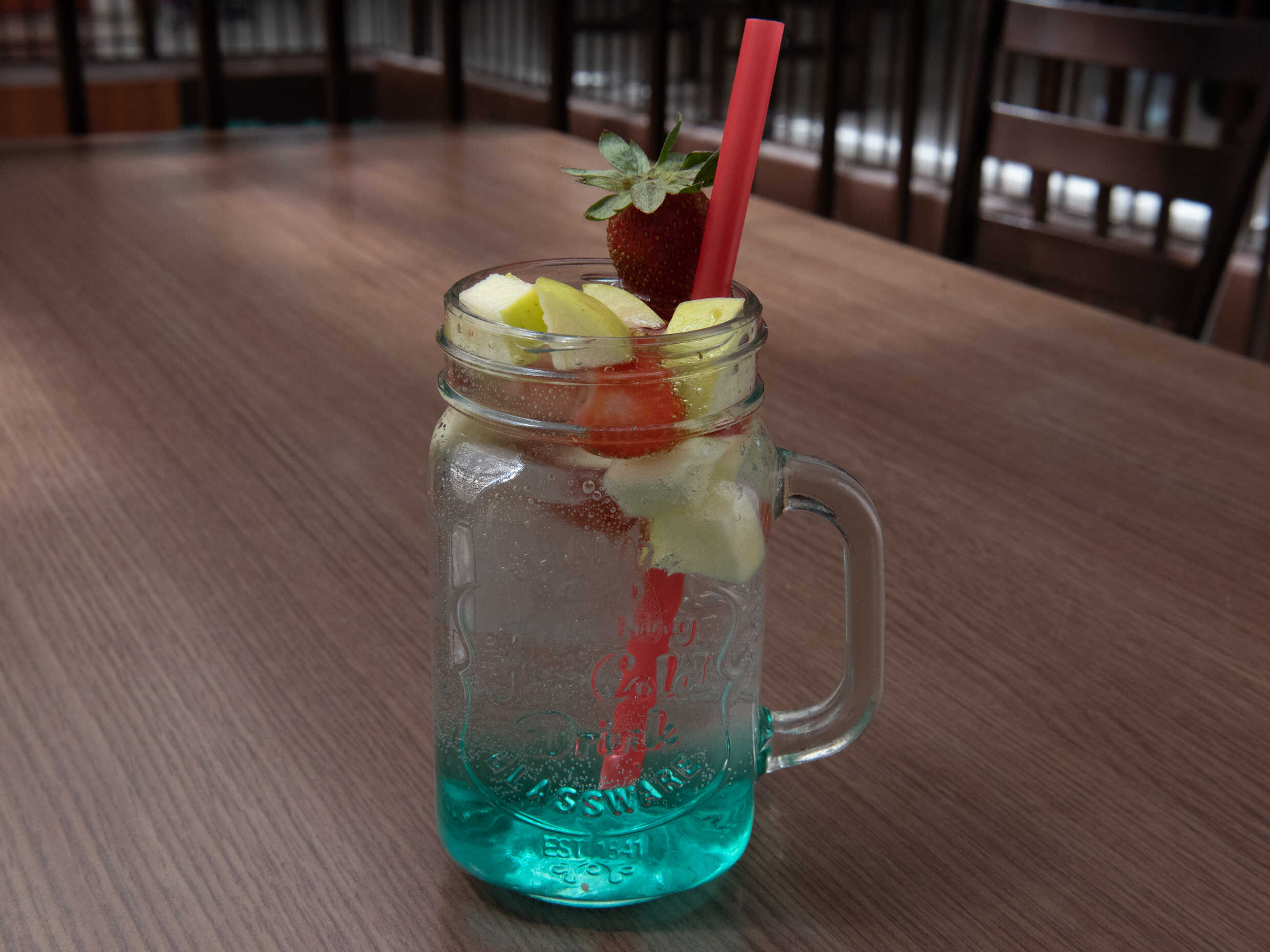 Refrescante soda italiana, elige el sabor de tu preferencia, acompañada con láminas de fresa y cubos de manzana verde, una bebida totalmente refrescante.
