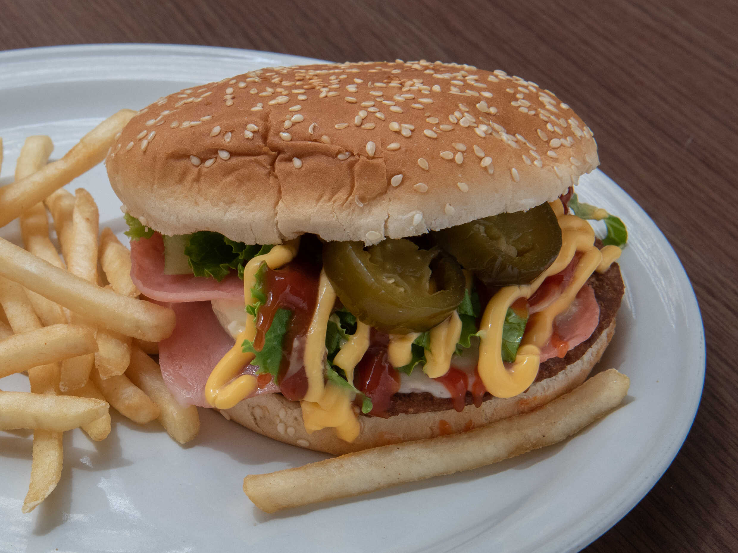 Lechuga, jitomate, jamón, queso oaxaca, queso americano, queso amarillo fundido, chiles en vinagre, cátsup, mayonesa.