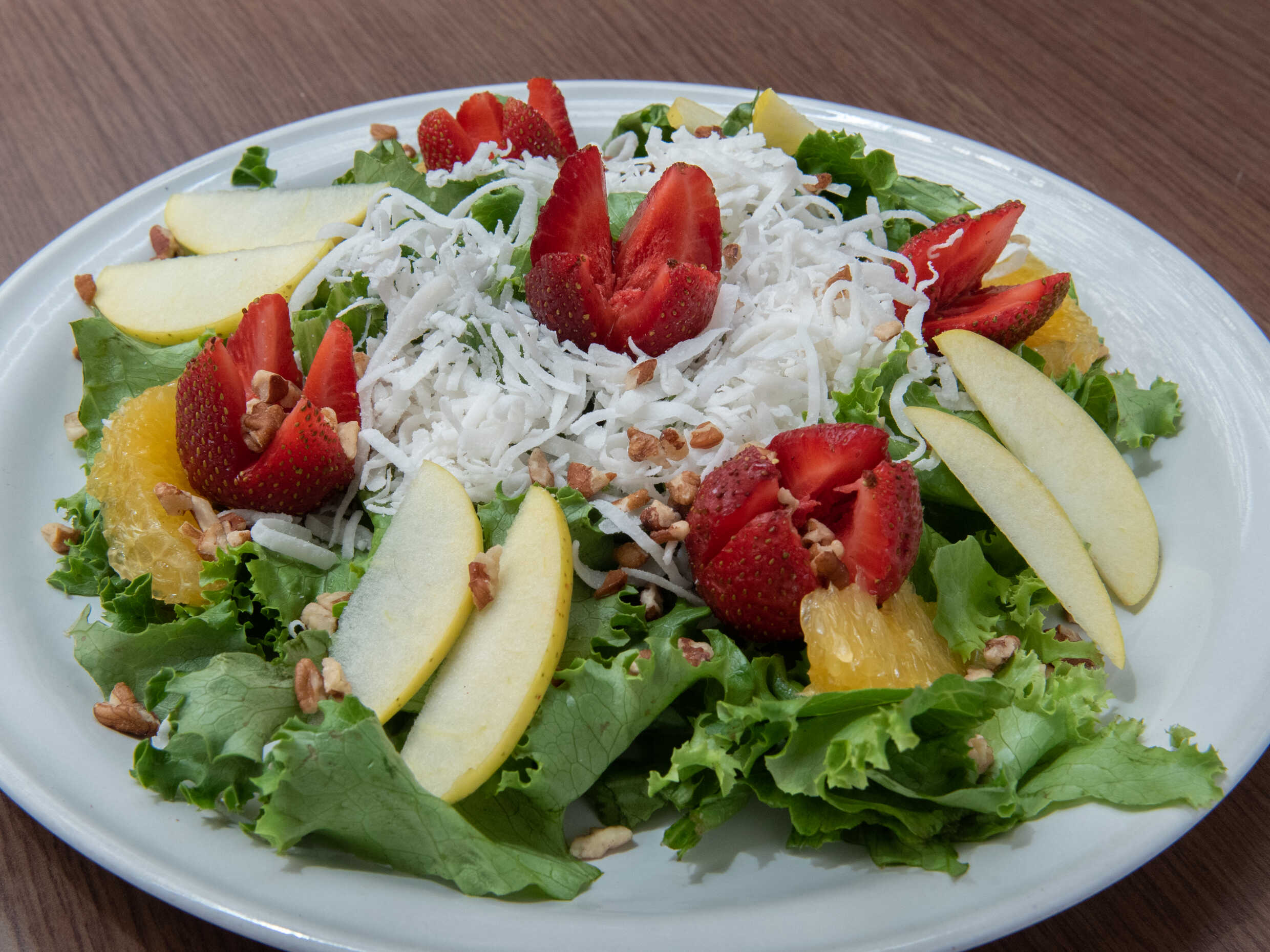 Lechuga, coco rayado, suprema de naranja, manzana, fresa, nuez, acompañado con aderezo de mayonesa con crema.