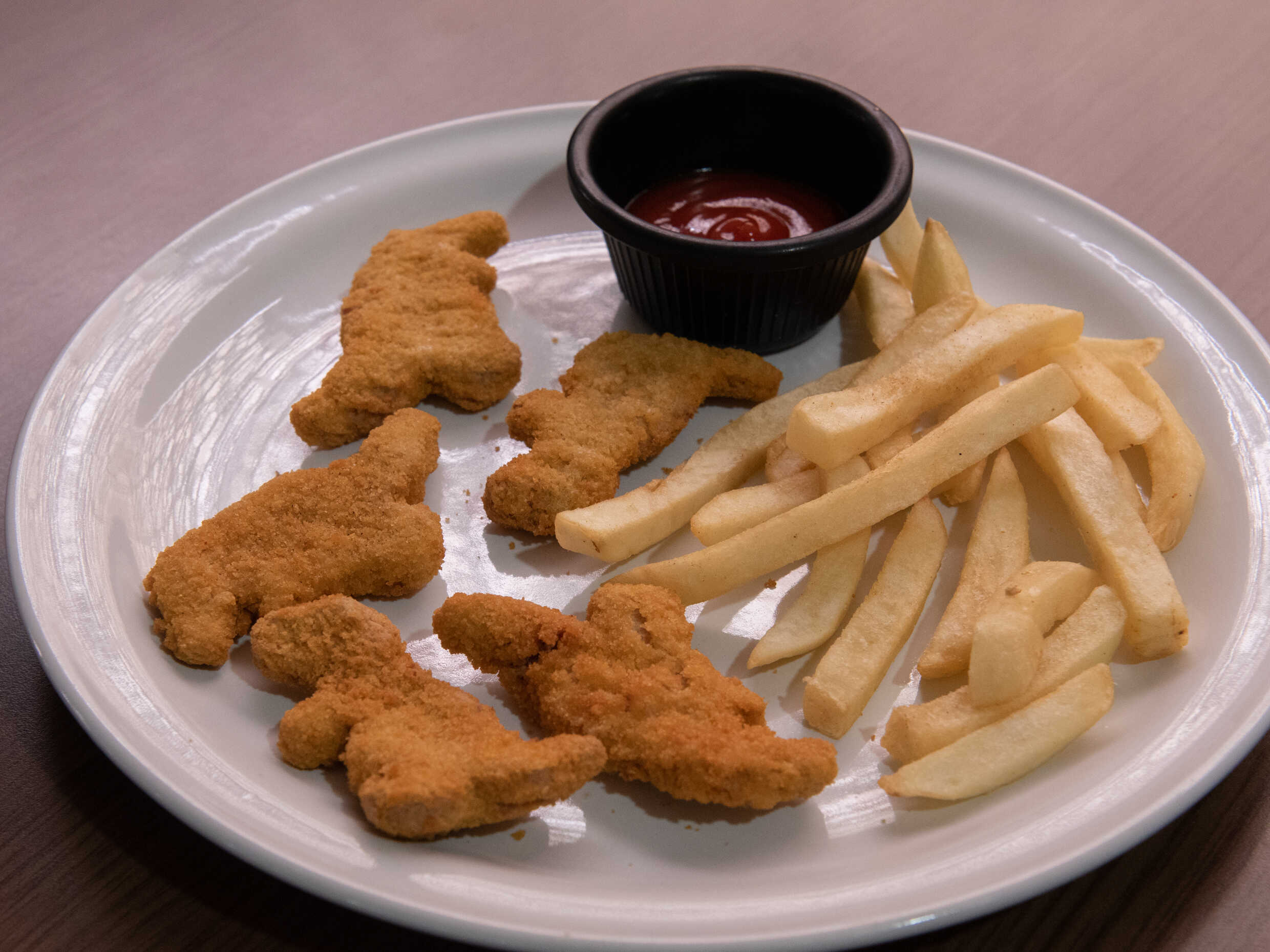 5 Piezas de nuggets en forma de dinosaurio con papas a la francesa.