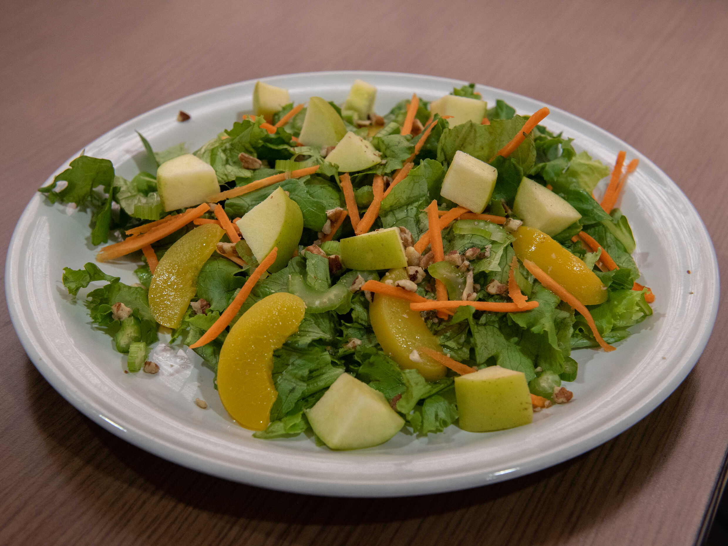 Lechuga, manzana verde, durazno en almíbar, apio, zanahoria, nuez, aderezo de crema y mayonesa.