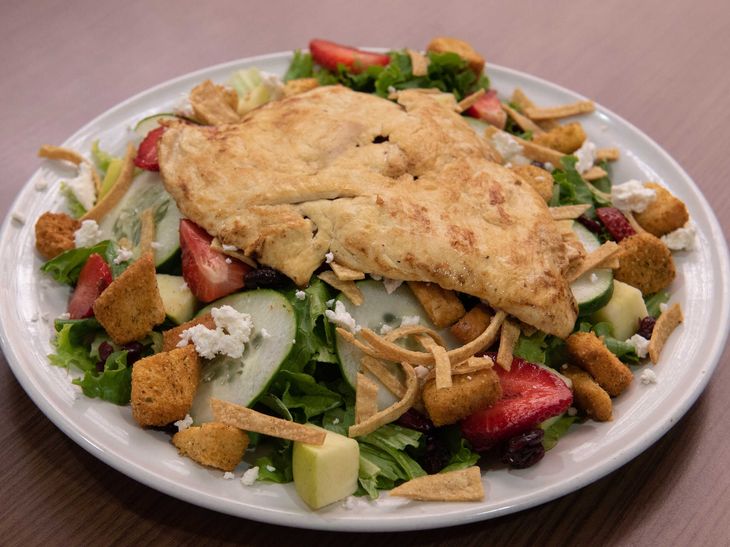 Lechuga, pollo asado, durazno, fresa, arándano, cacahuate, crotones, nuez, ajonjolí garapiñado, queso panela.