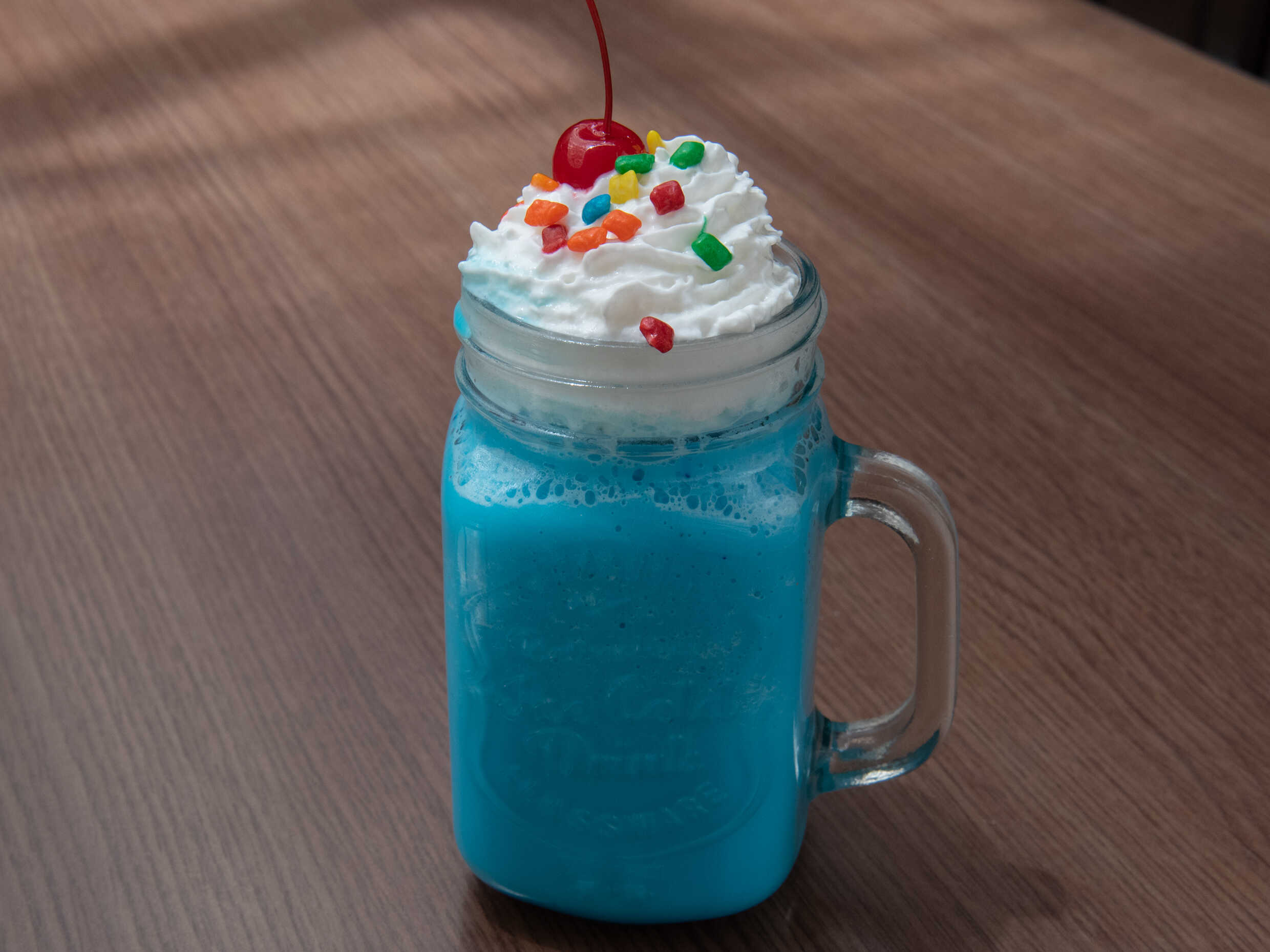 Frappé sabor chicle, decorada con crema batida, cereza y mini chicles.