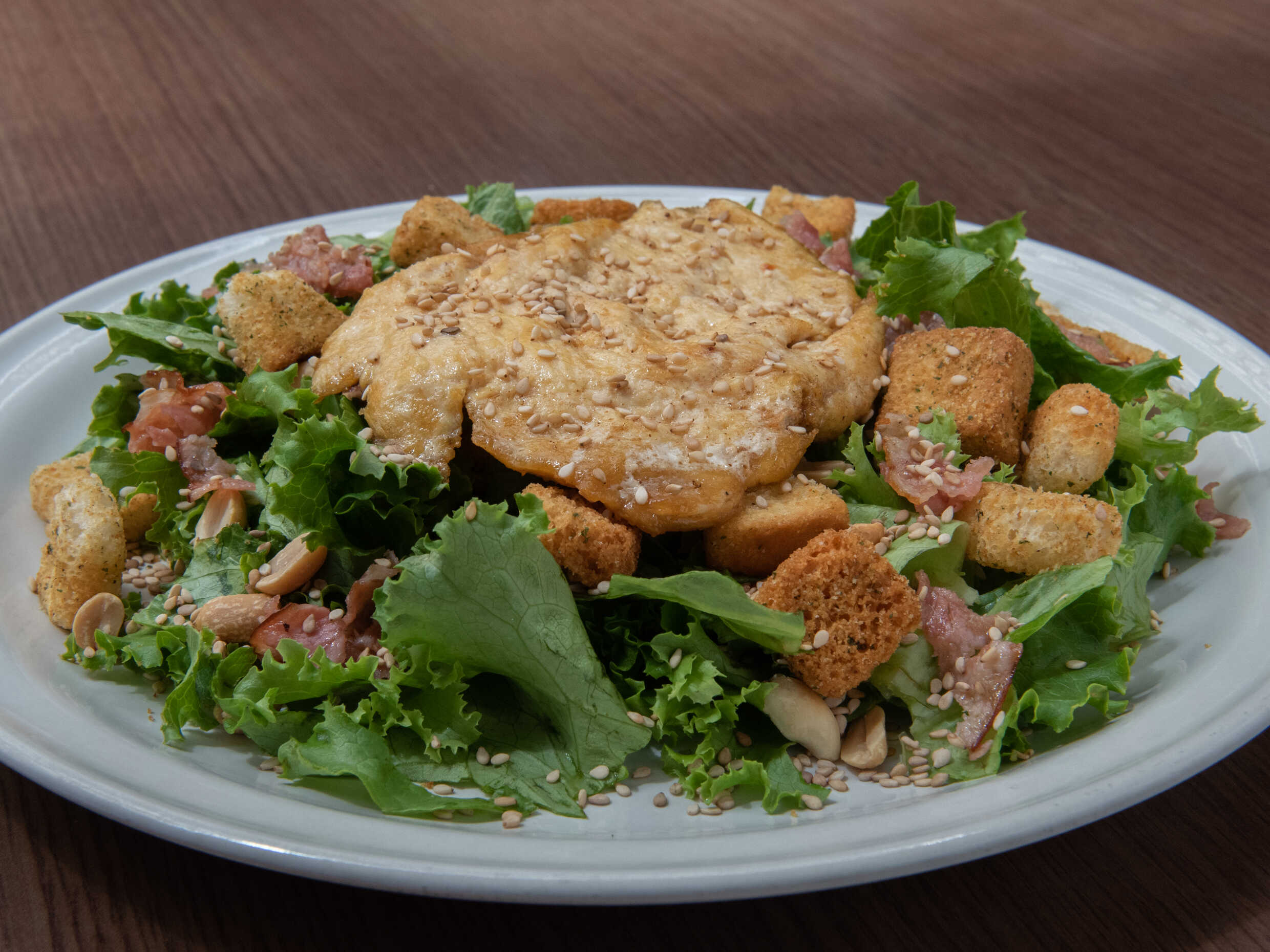 Lechuga, pollo asado, ajonjolí, cacahuate, tocino frito, acompañado con aderezo ranch o mil islas y crotones.